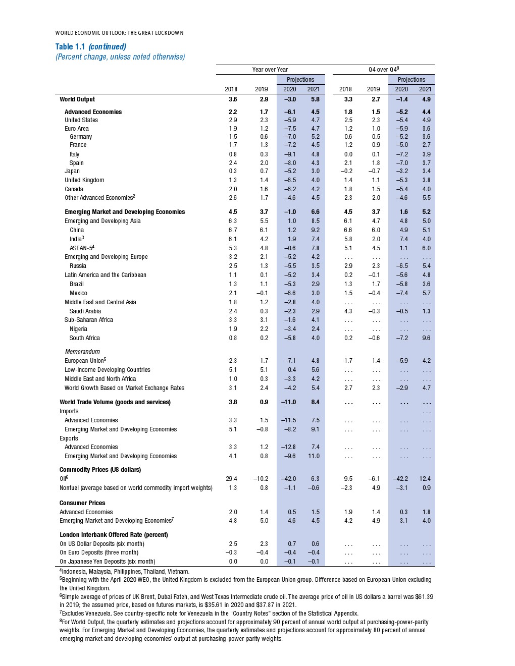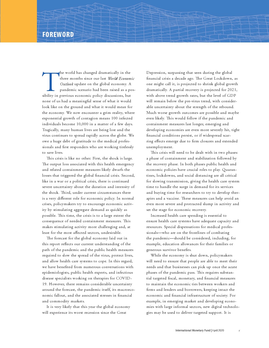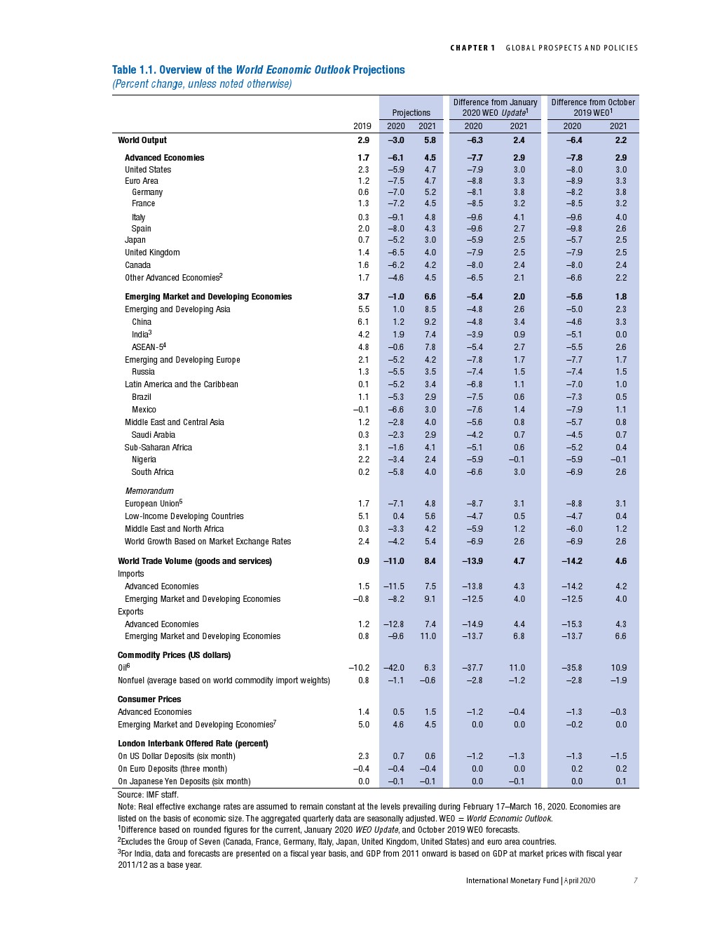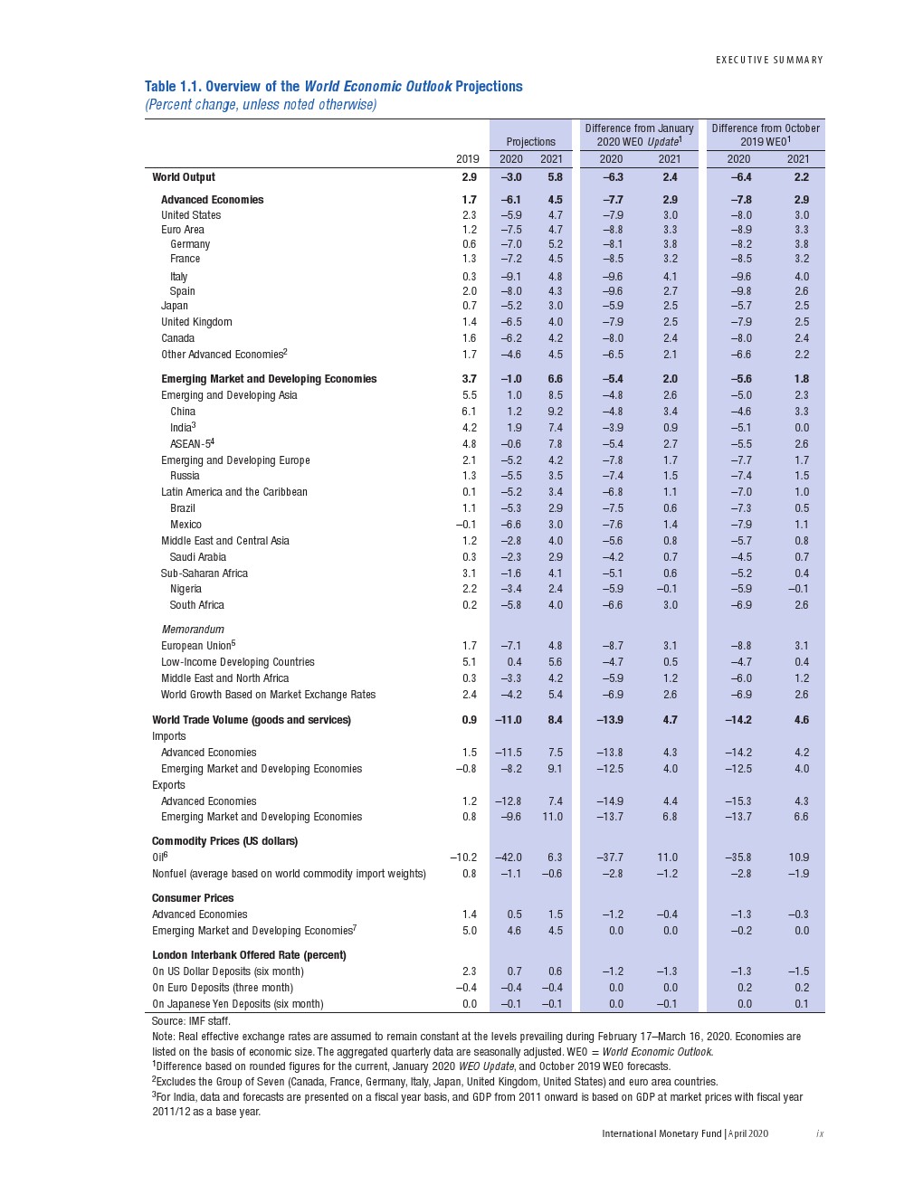 国际货币基金组织发布了“2020年4月全球经济概览”。由于COVID-19大流行,预计2020年全球经济将大幅收缩3%,比2008-09年金融危机期间严重得多。