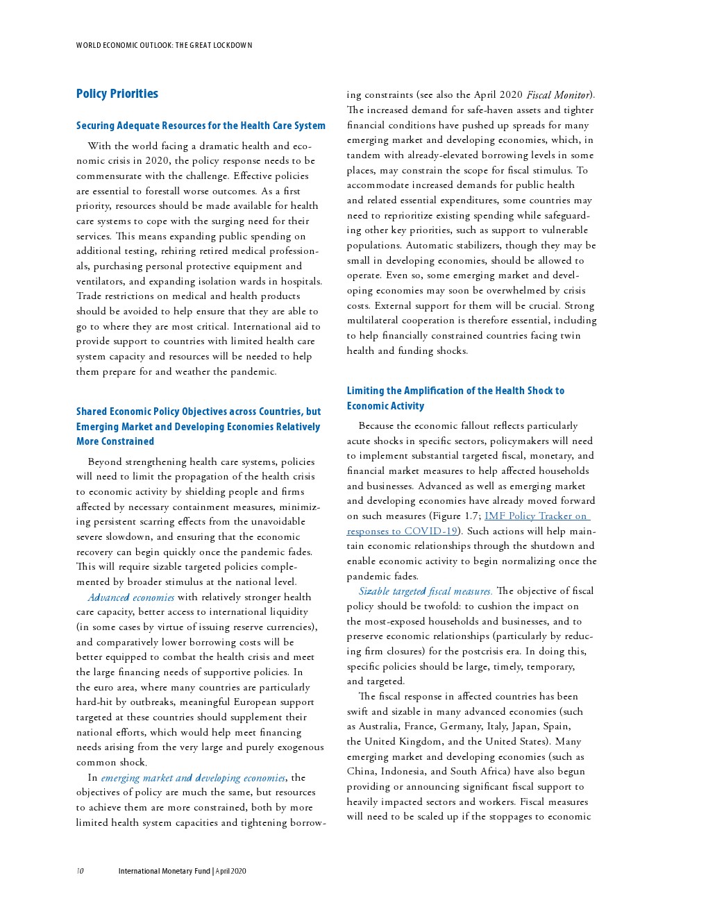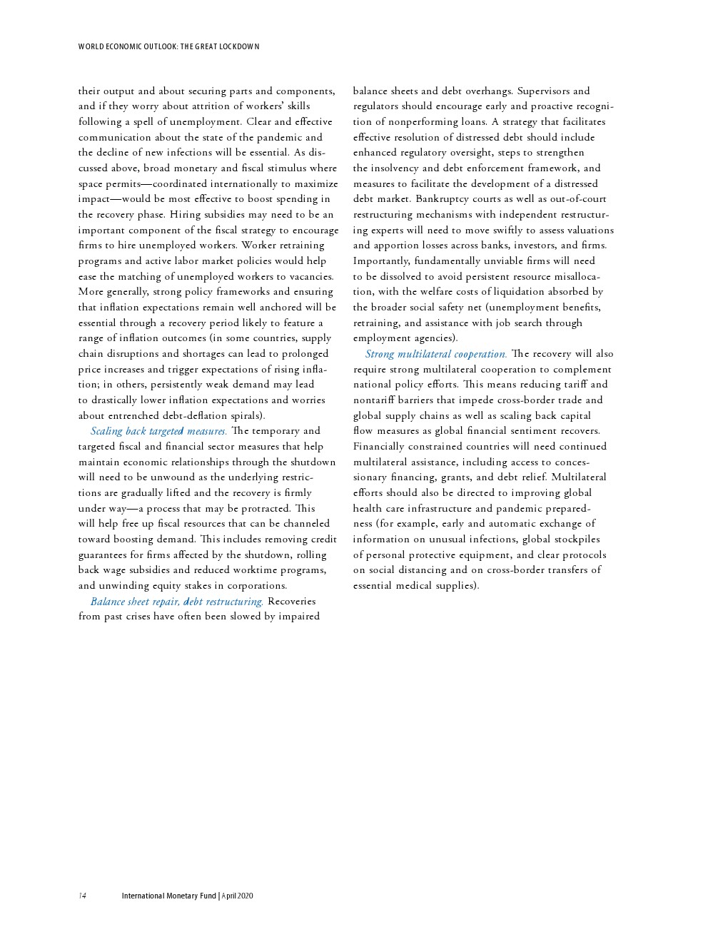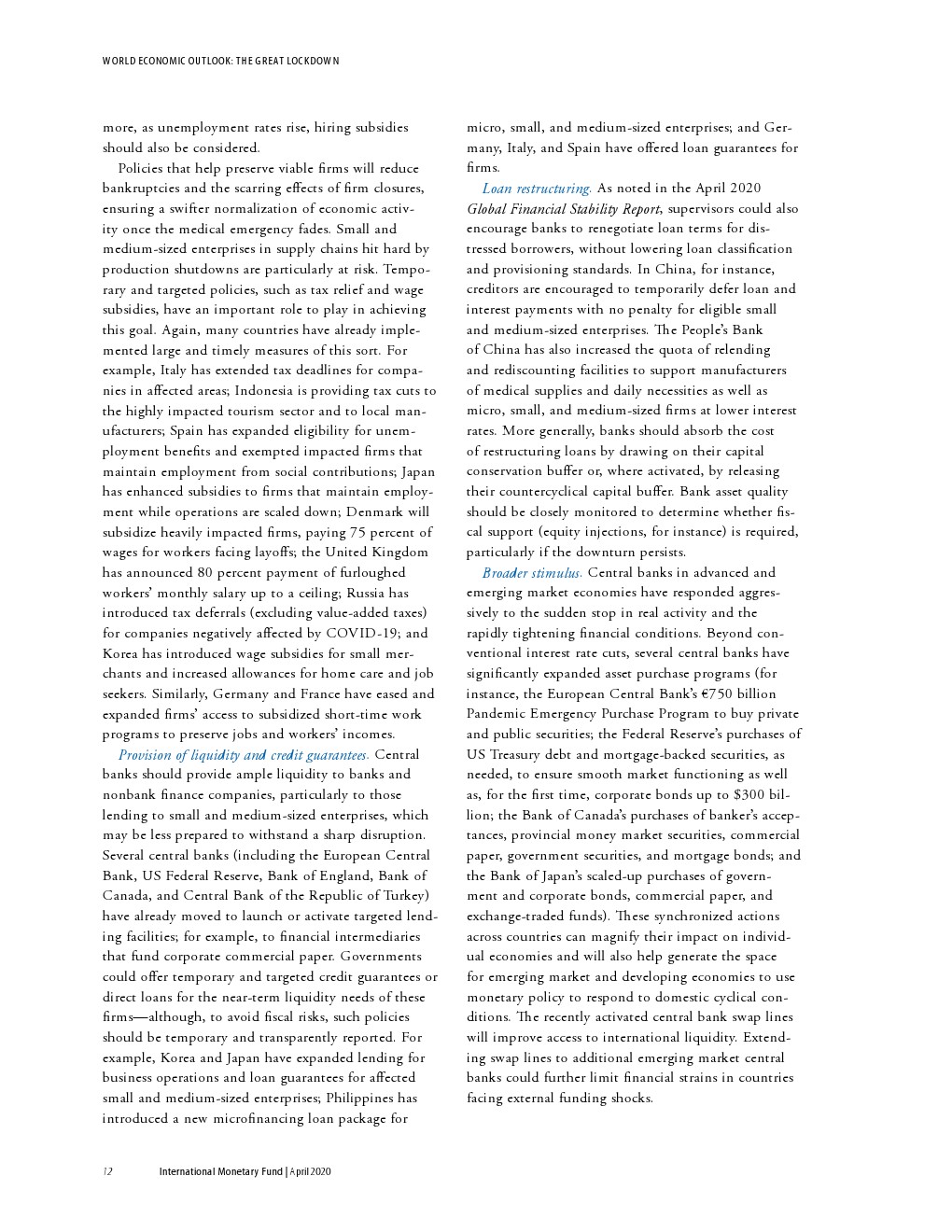 由于疫情对某些行业产生特别严重的冲击,政策制定者将需要实施大量有针对性的金融、货币和市场措施,以支持受影响的家庭和企业。这些行动将有助于在整个停摆期间保持经济关系,以及大流行减弱和遏制措施解除后活动能够逐步正常化至关重要。