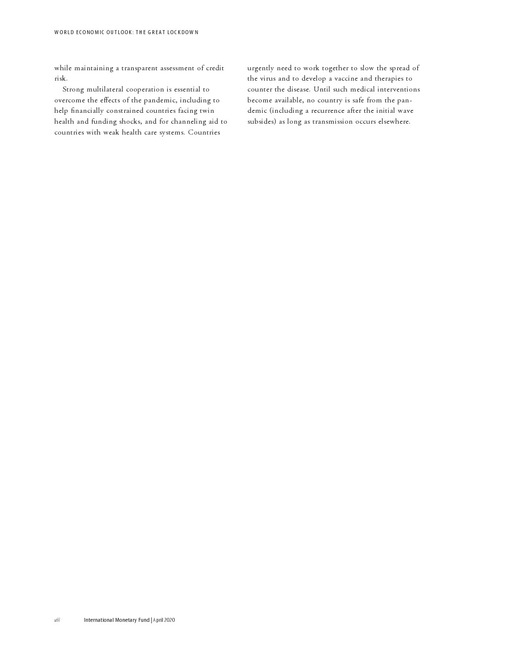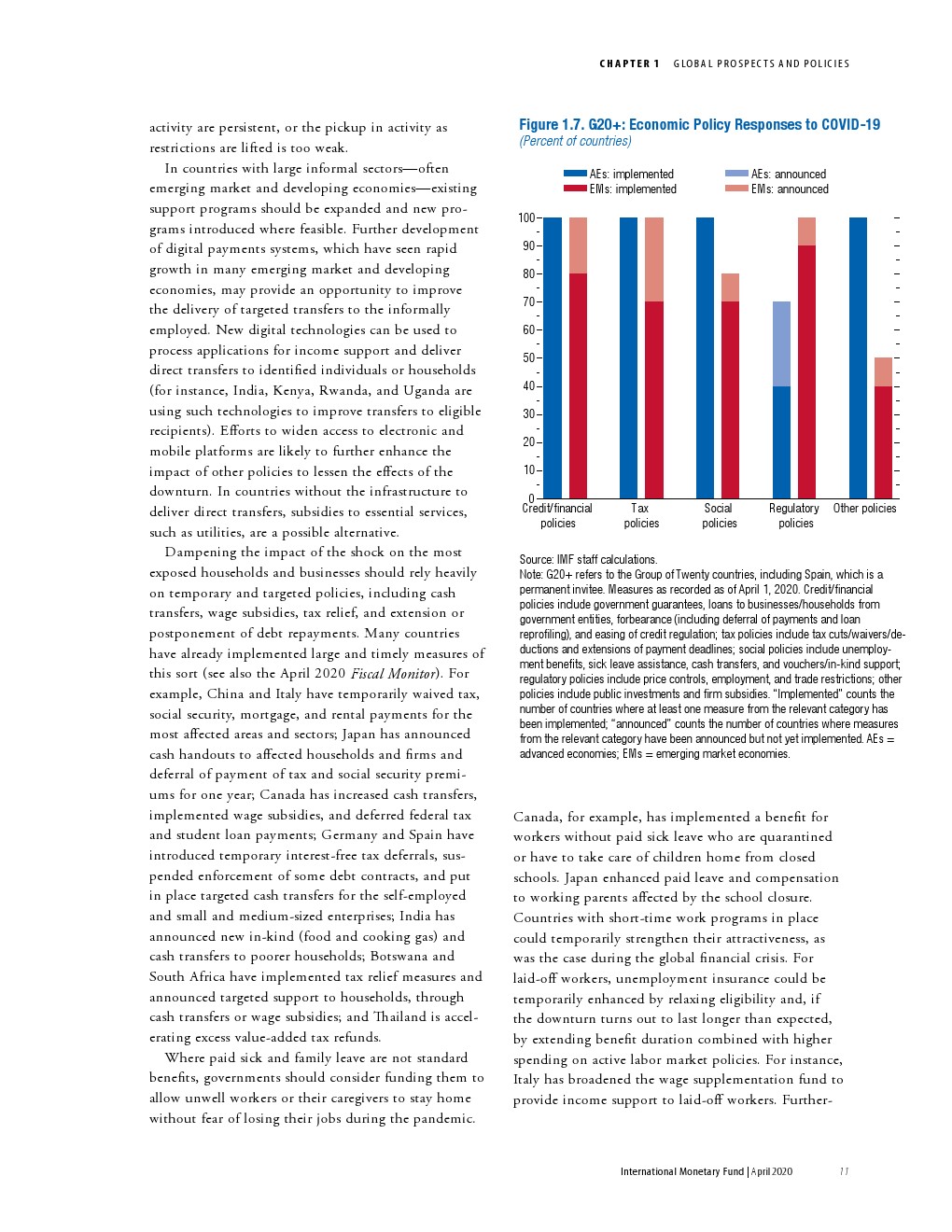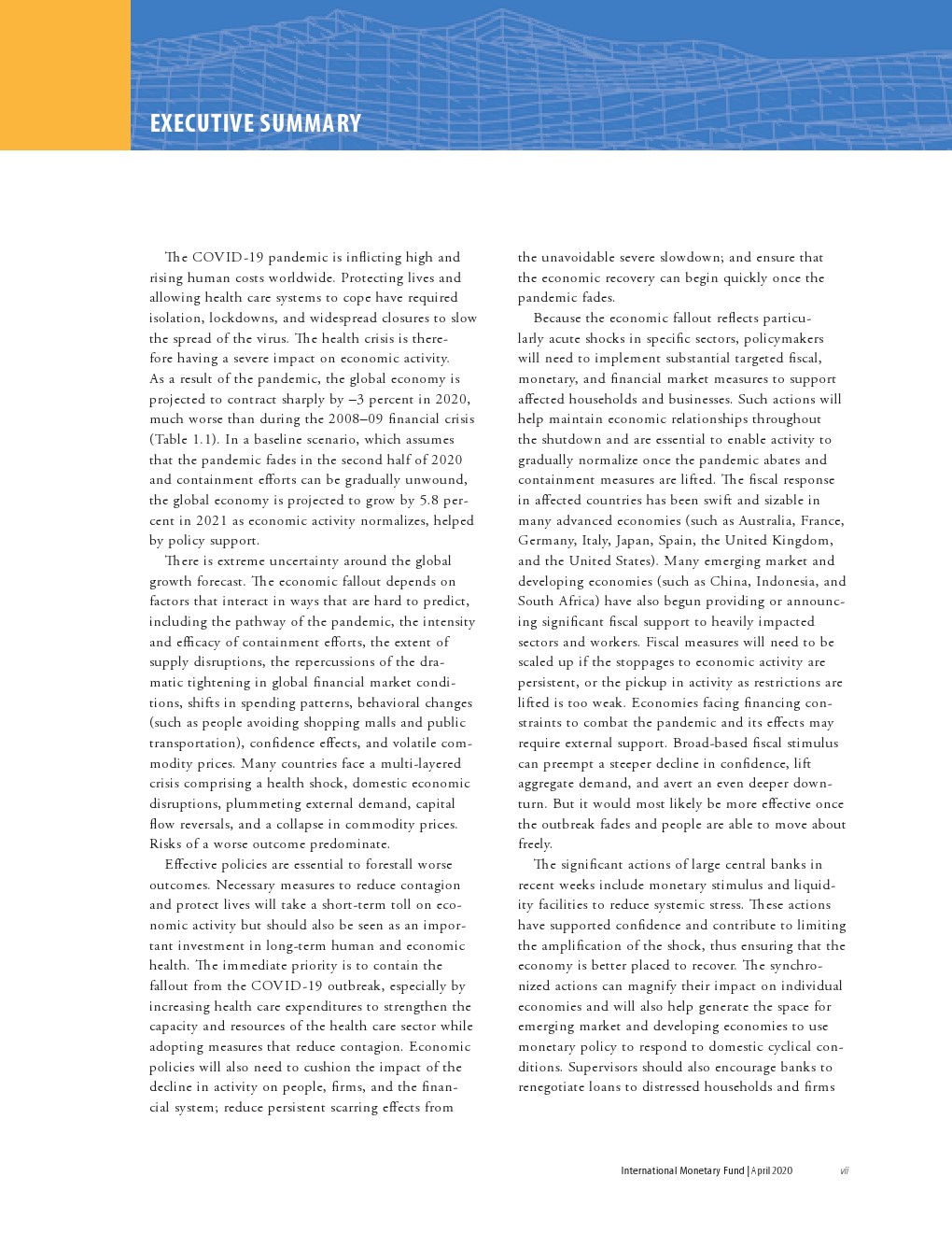 由于疫情对某些行业产生特别严重的冲击,政策制定者将需要实施大量有针对性的金融、货币和市场措施,以支持受影响的家庭和企业。这些行动将有助于在整个停摆期间保持经济关系,以及大流行减弱和遏制措施解除后活动能够逐步正常化至关重要。