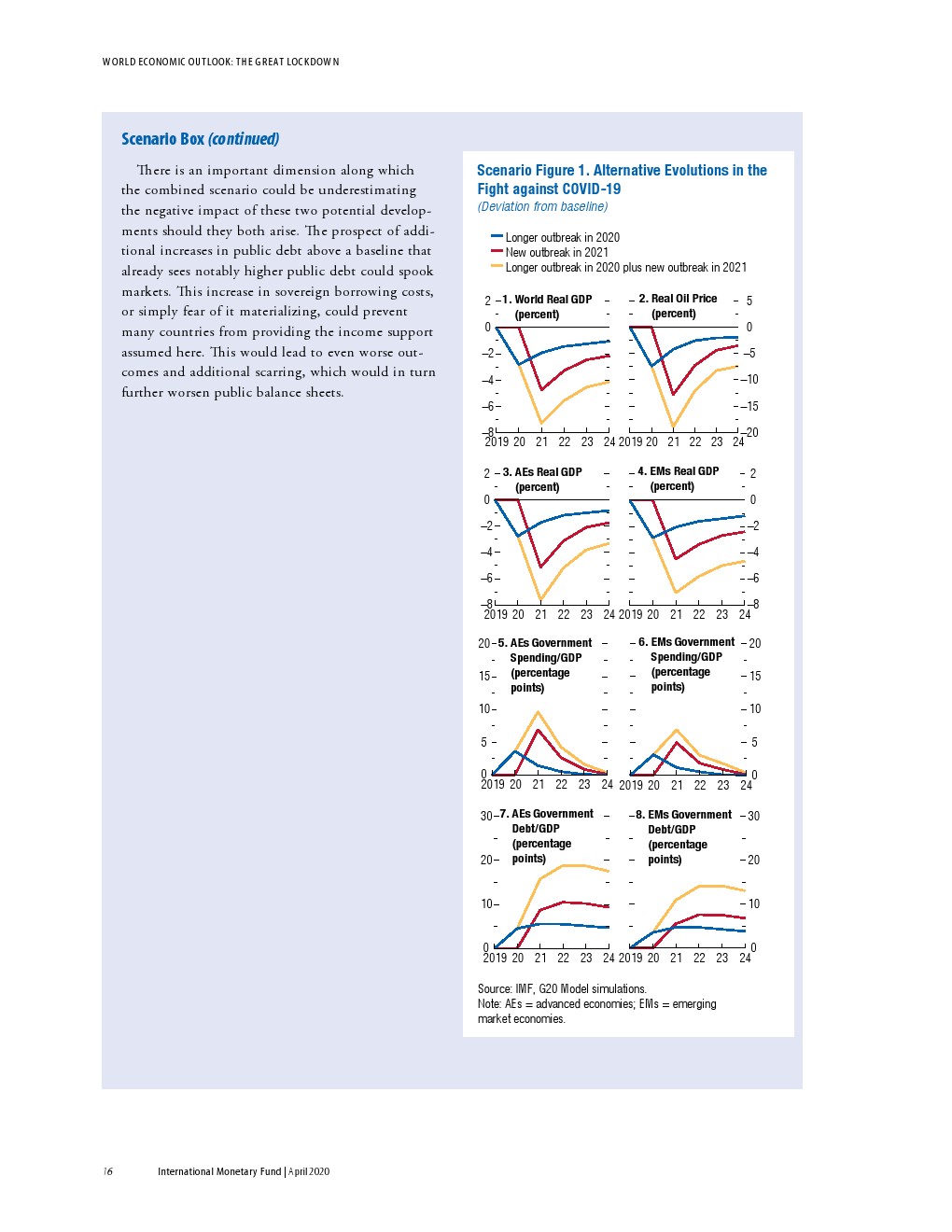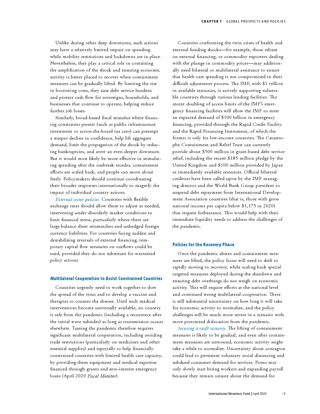 大型央行最近几周的重要行动包括货币刺激和流动性措施以减轻系统性压力。这些行动支持了人们的信心,并有助于限制冲击的扩大,从而确保经济复苏条件。同步行动可以扩大其对单个经济体的影响,也将为新兴市场和发展中经济体利用货币政策应对国内周期性条件创造空间。监管者还应鼓励银行向陷入困境的家庭和金融机构提供贷款,同时保持对信贷风险的透明评估。