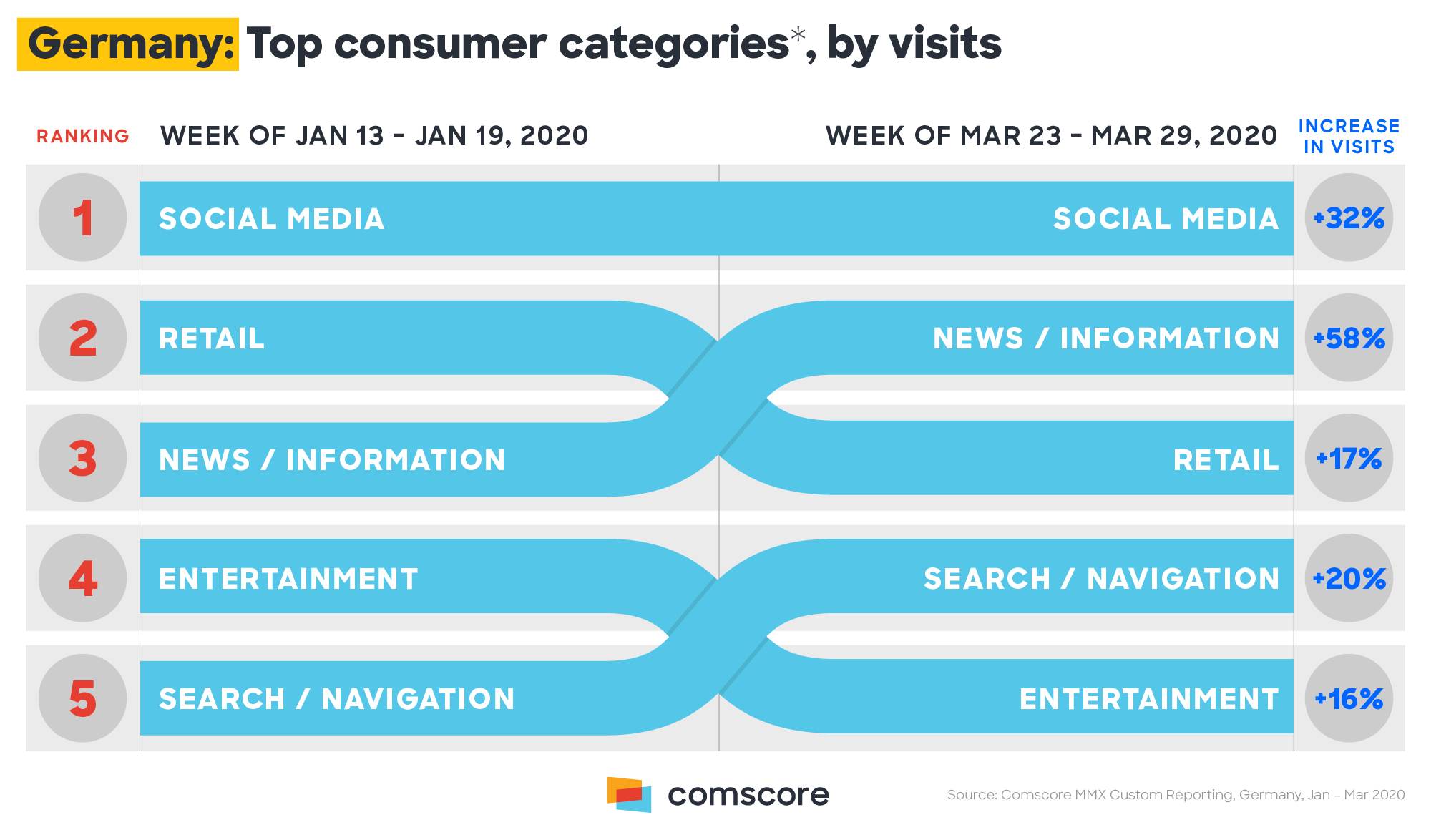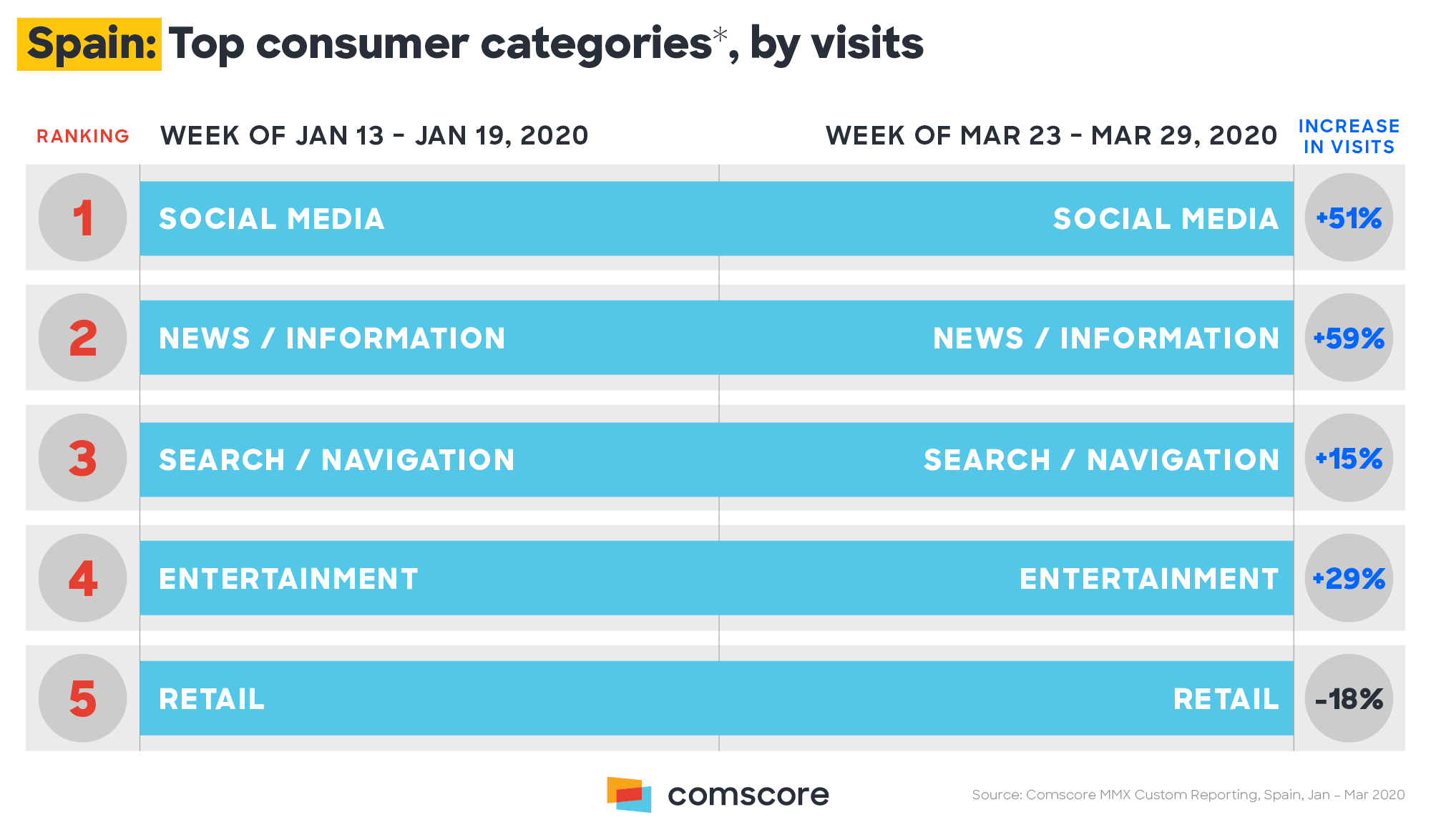 社交媒体网站或应用的访问量使其他类别相形见绌,这一模式在欧盟其他5国也是如此。危机前的前五大类别(即2020年1月13日-19日的一周)在危机期间保持不变,但访问量大幅增加。相对位置有些不同,“新闻/信息”的排名超越了“娱乐”,前者访问量跃升了63%。