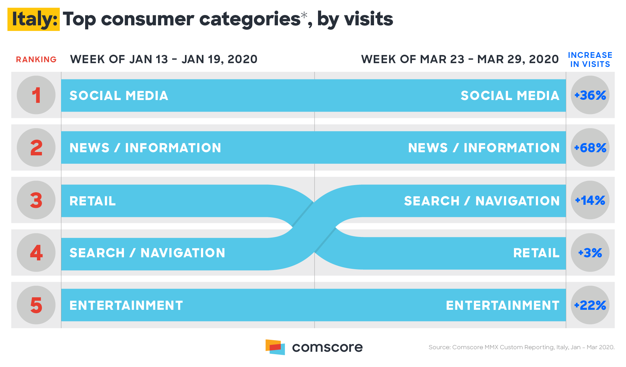 意大利是欧洲第一个受到病毒影响的国家。与2020年1月13日-19日相比,2020年3月23日-29日当周,“新闻/资讯”的访问量激增了68%;而“零售”的访问量只增加了3%,导致该类别在3月23-29日这一周失去了一个位置,降至第四。