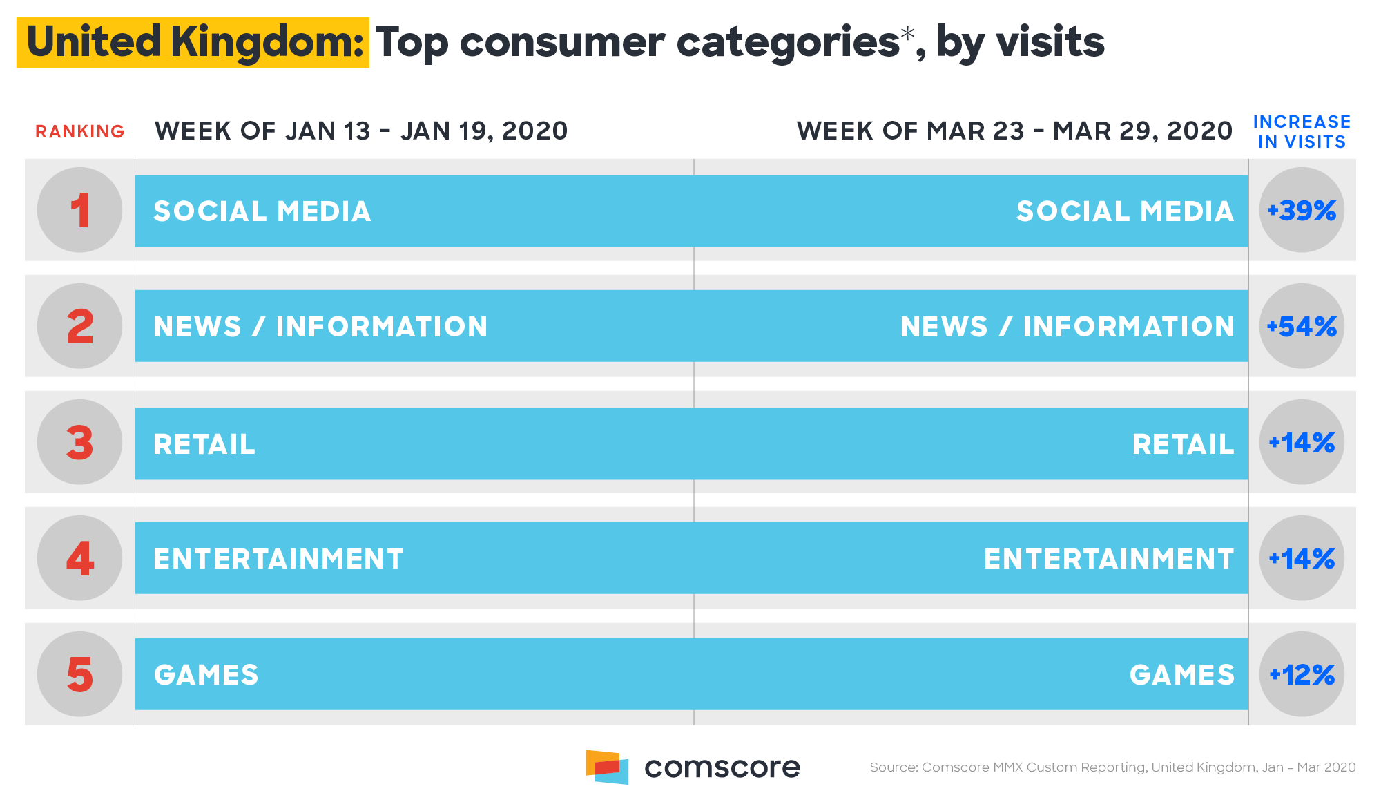 与其他欧洲国家一样,“社交媒体”产生的访问量最多,而“新闻/资讯”的访问量增长了59%。与其他欧盟5国不同的是“零售”的访问数量下降了18%,降幅相当大,这主要是由于服装和运动/户外子类别的下降。相反,图书和食品/杂货增长显著,因为一些消费者通过寻找新的阅读内容或在线订购杂货来适应新环境。