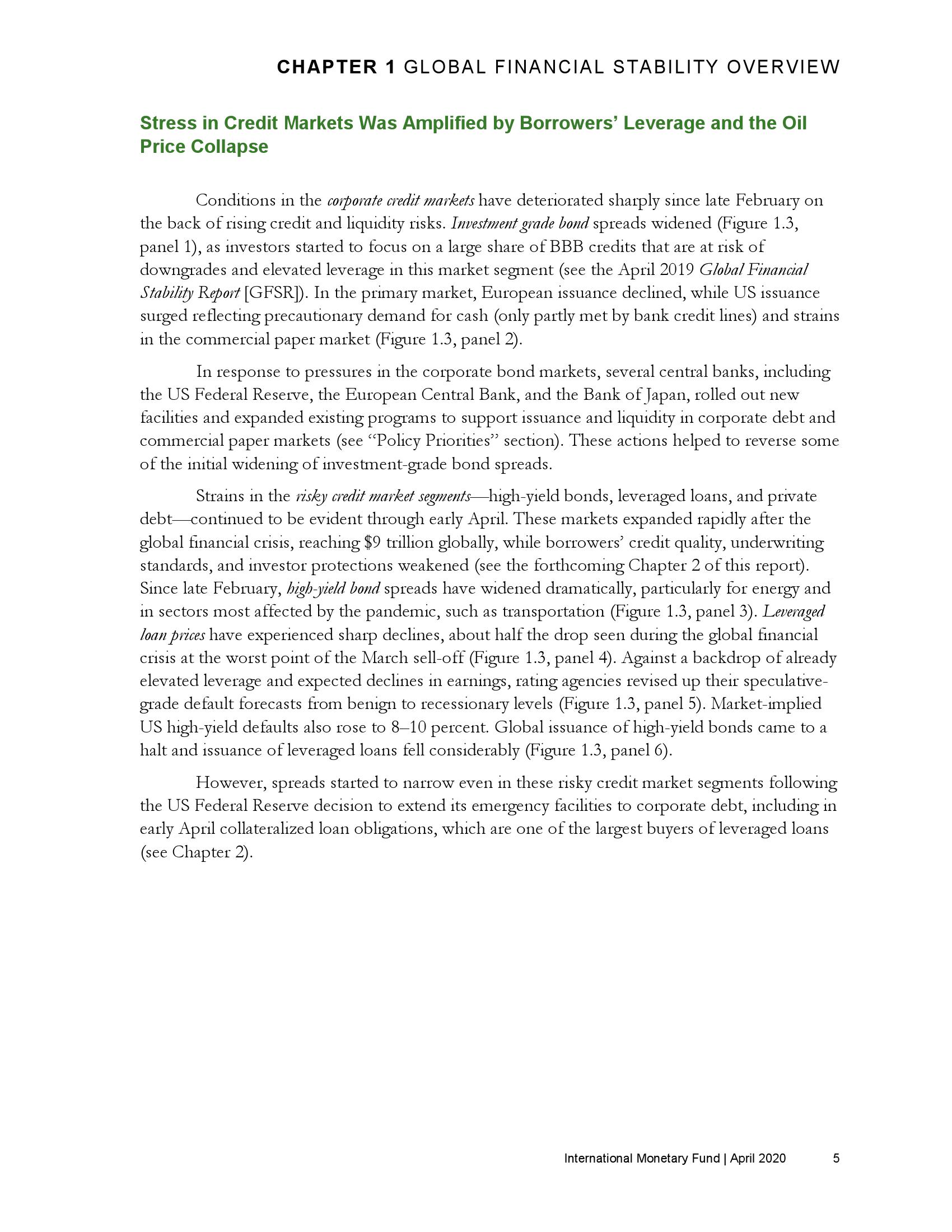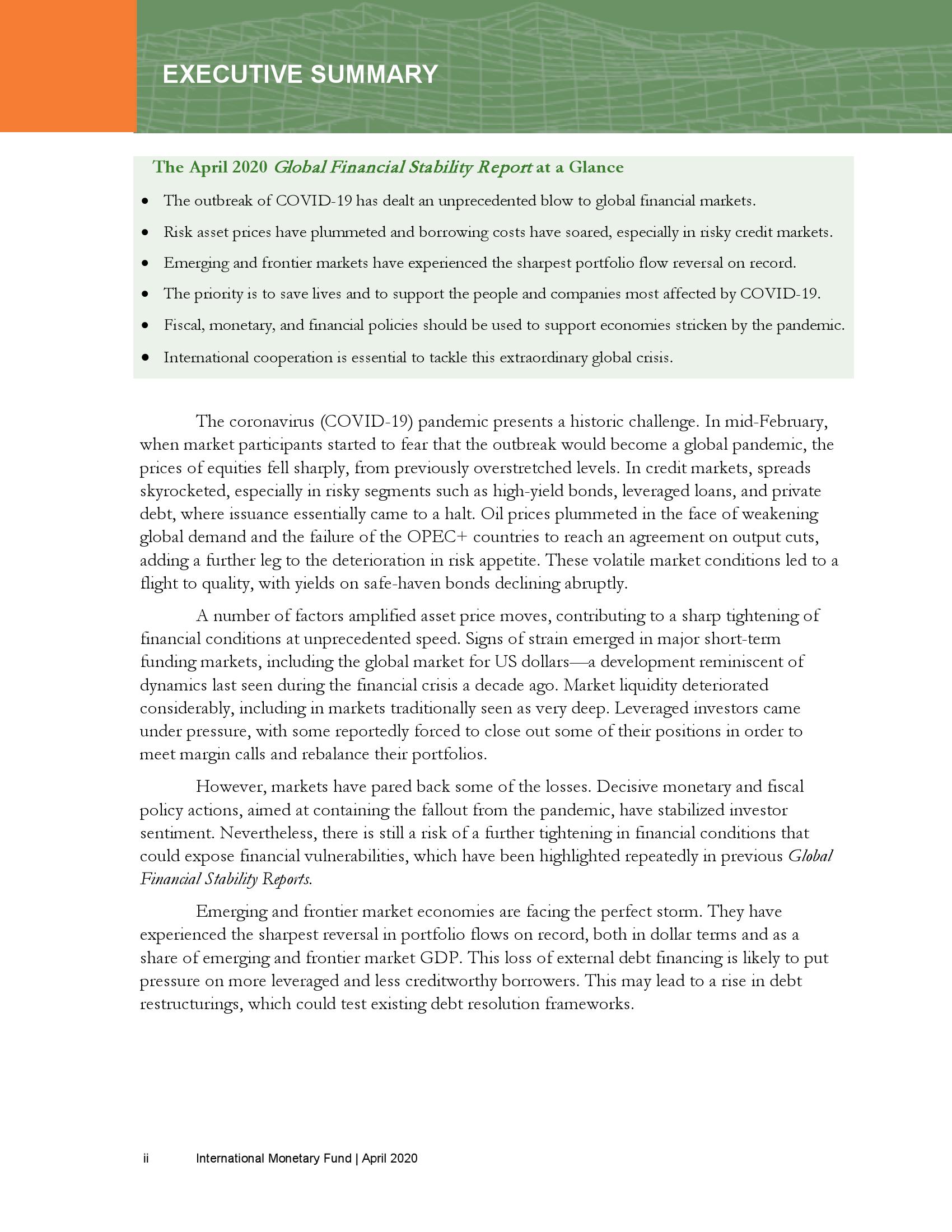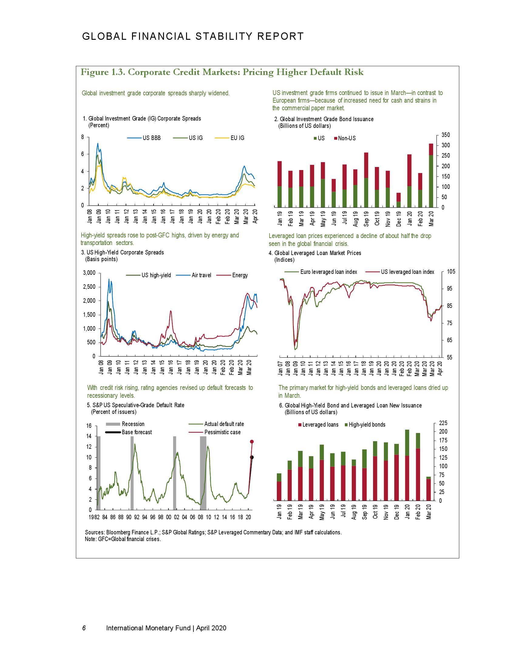 《报告》显示,新冠肺炎疫情带来了历史性挑战。2月中旬,市场参与者开始担忧疫情可能演变成全球性流行病,股价从此前的过高水平大幅下跌。信贷市场利差飙升,特别是在高收益率债券、杠杆贷款和私人债务等高风险领域,以至于这些领域的发行活动基本停滞。