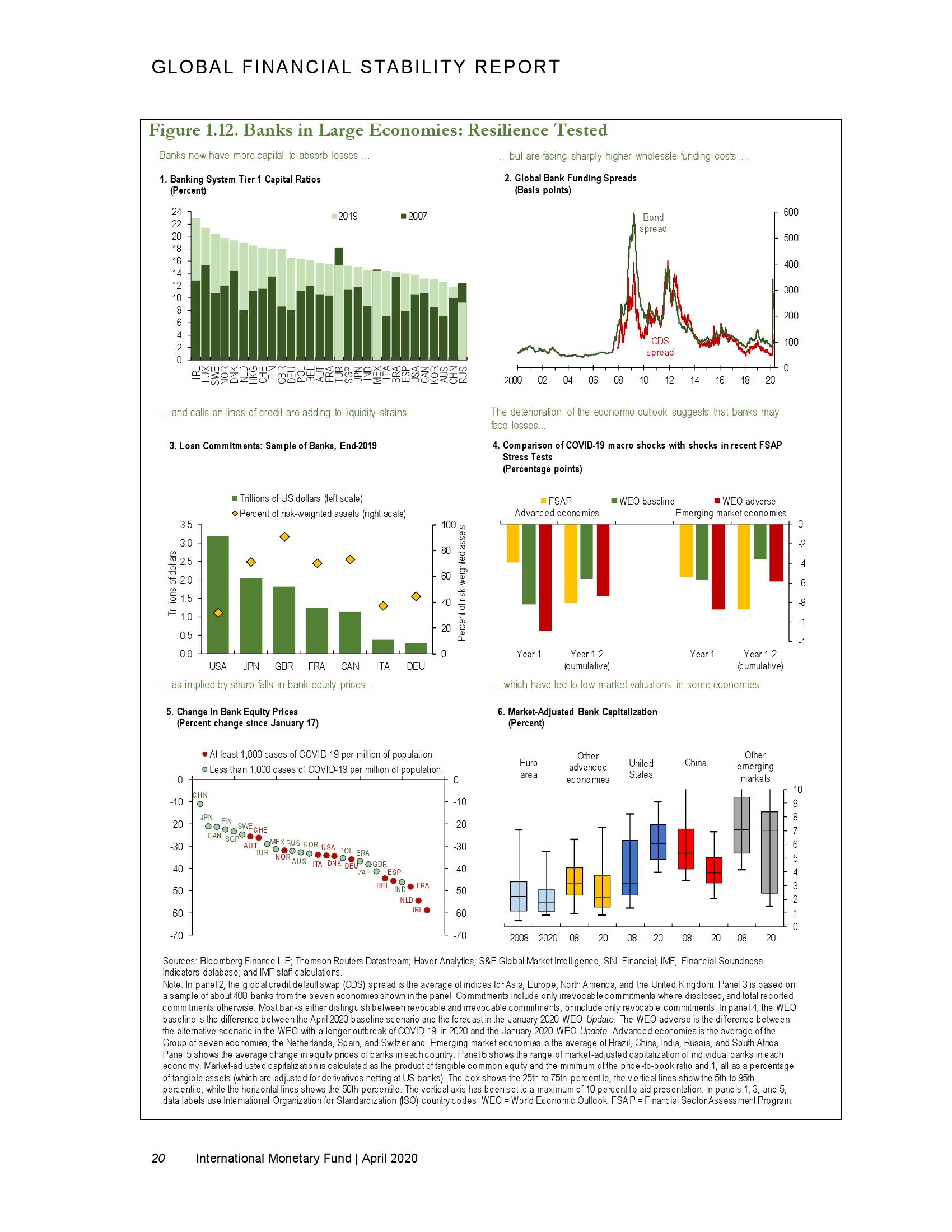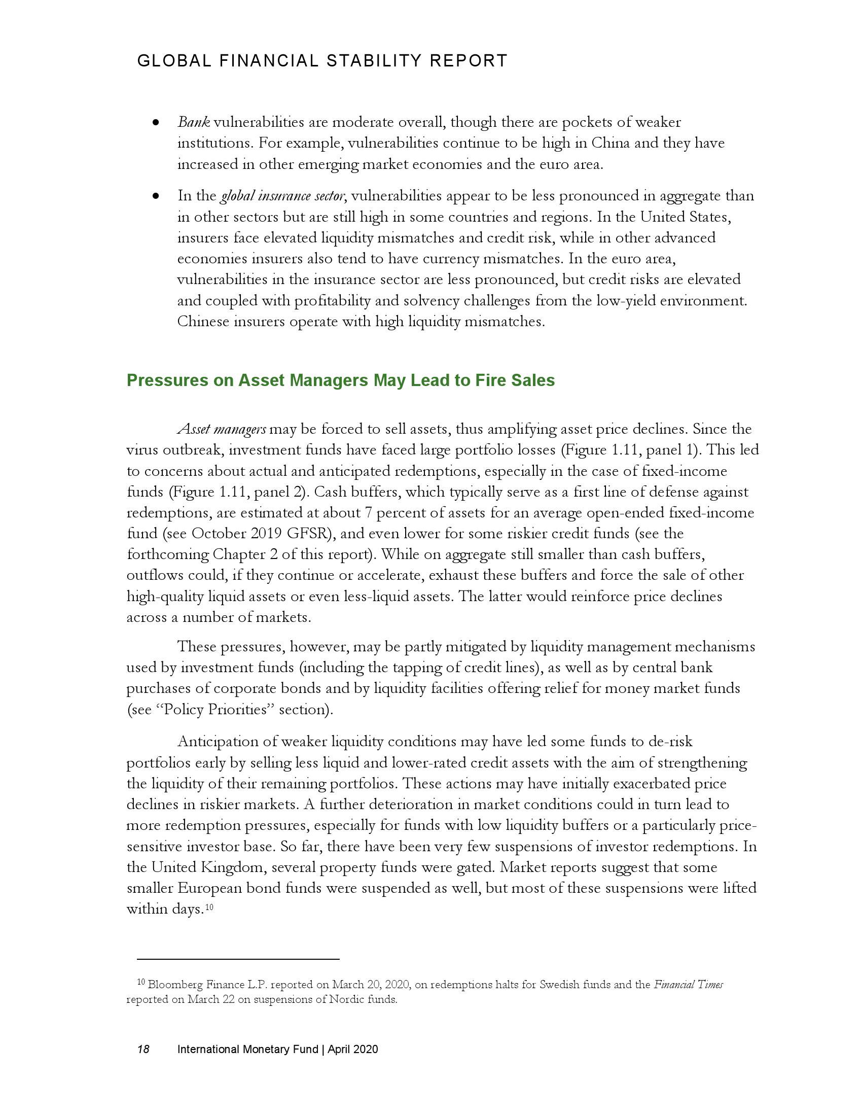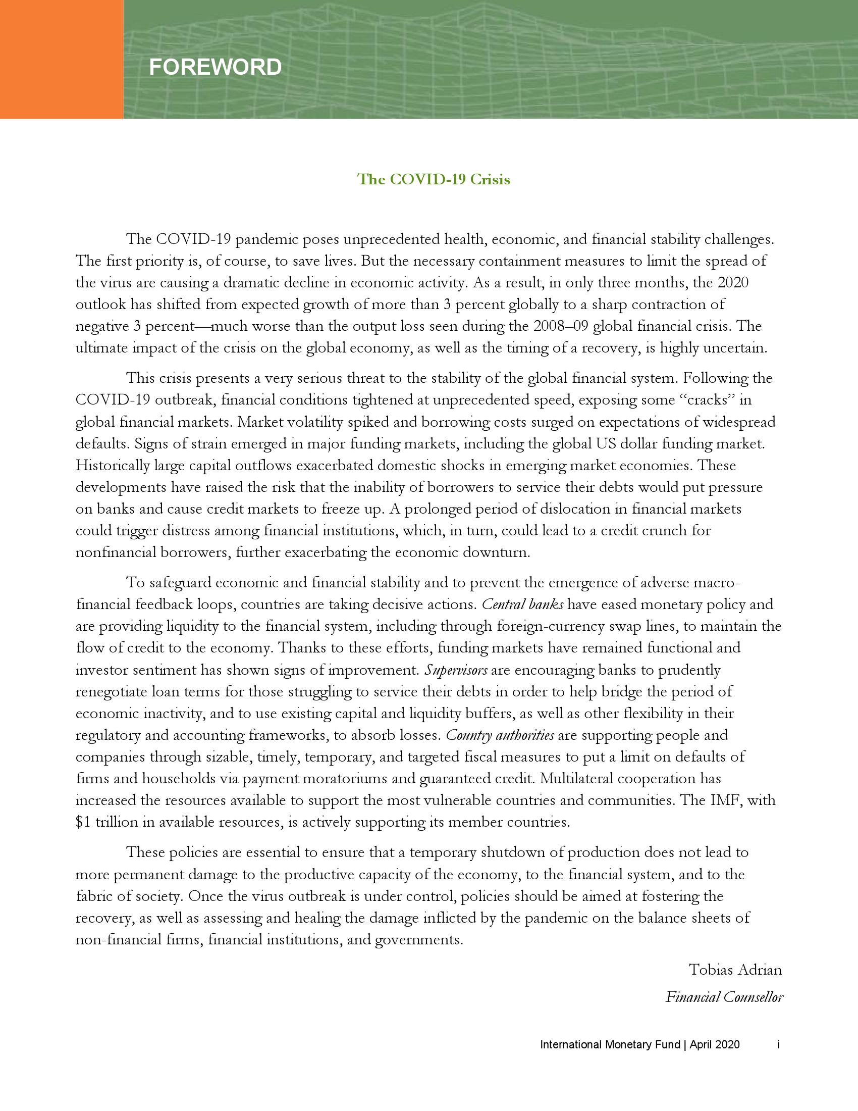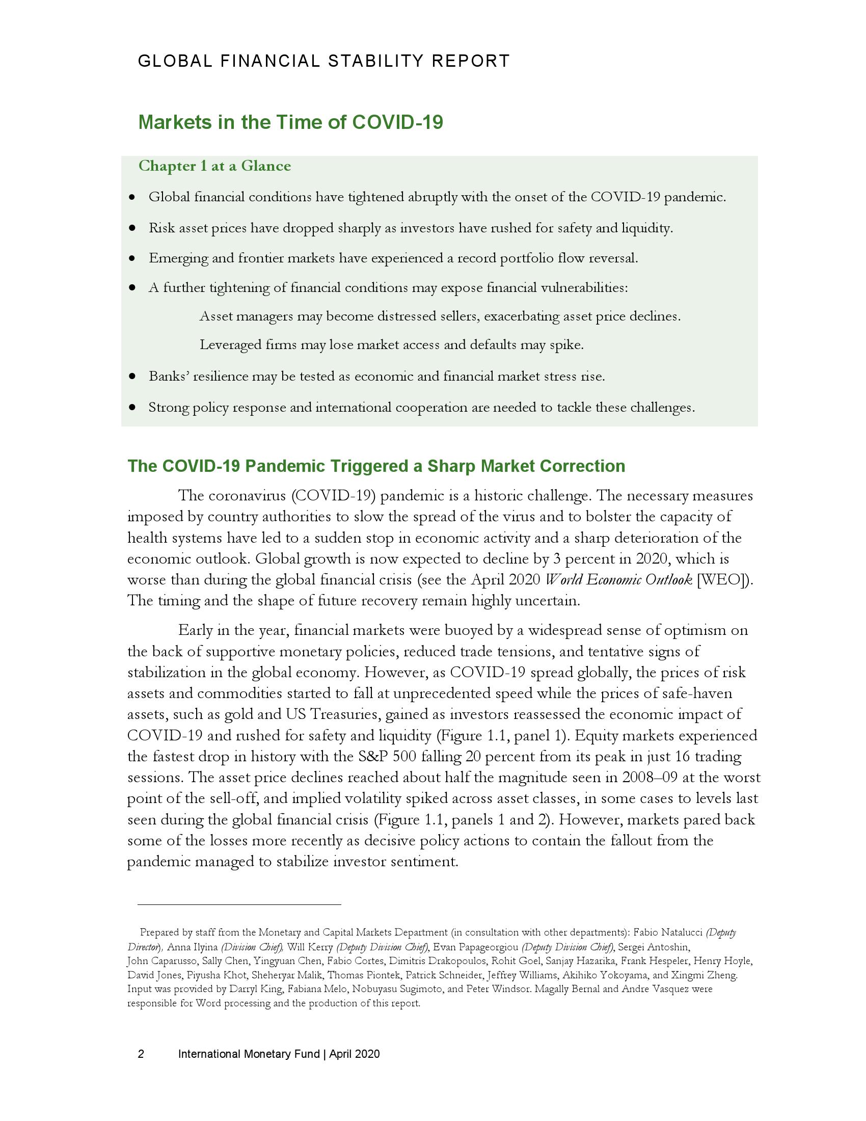 《报告》显示,新冠肺炎疫情带来了历史性挑战。2月中旬,市场参与者开始担忧疫情可能演变成全球性流行病,股价从此前的过高水平大幅下跌。信贷市场利差飙升,特别是在高收益率债券、杠杆贷款和私人债务等高风险领域,以至于这些领域的发行活动基本停滞。