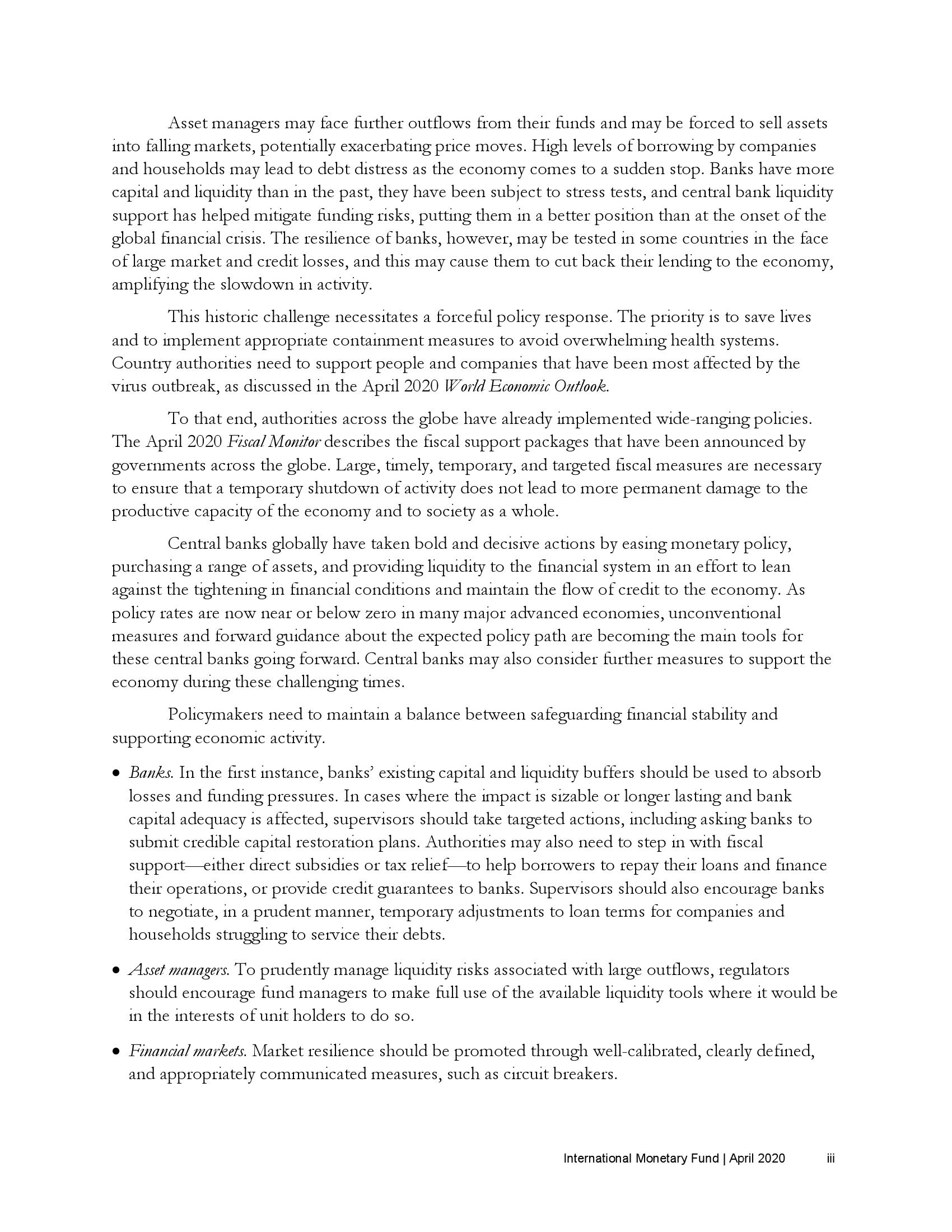 《报告》指出,全球各国当局已出台一系列的政策。2020年4月《财政监测报告》描述了全球各国政府已宣布的一揽子财政支持。当局有必要采取大规模、及时、临时和有针对性的财政措施,以确保经济活动的暂时停滞不会给经济的生产能力和整个社会带来持久性破坏。