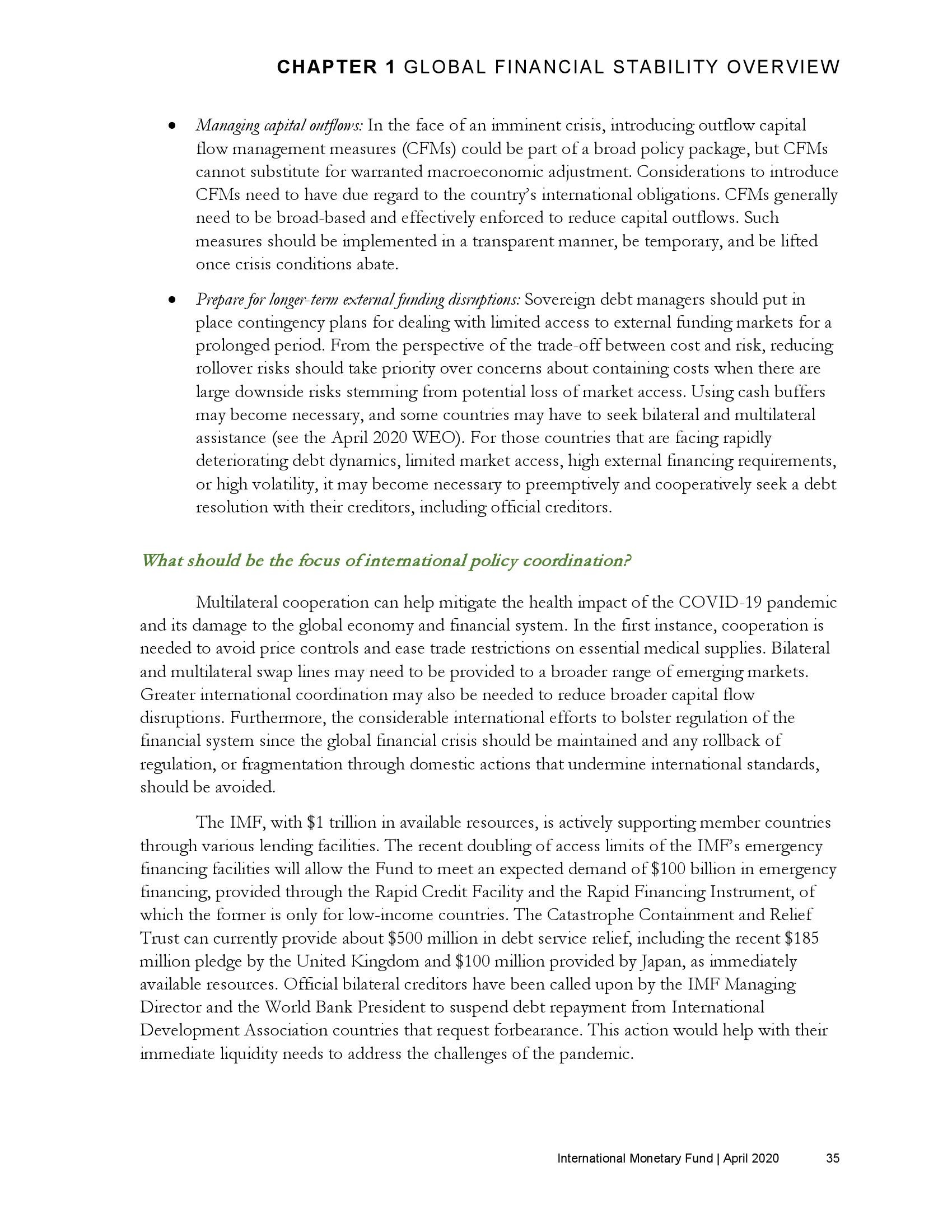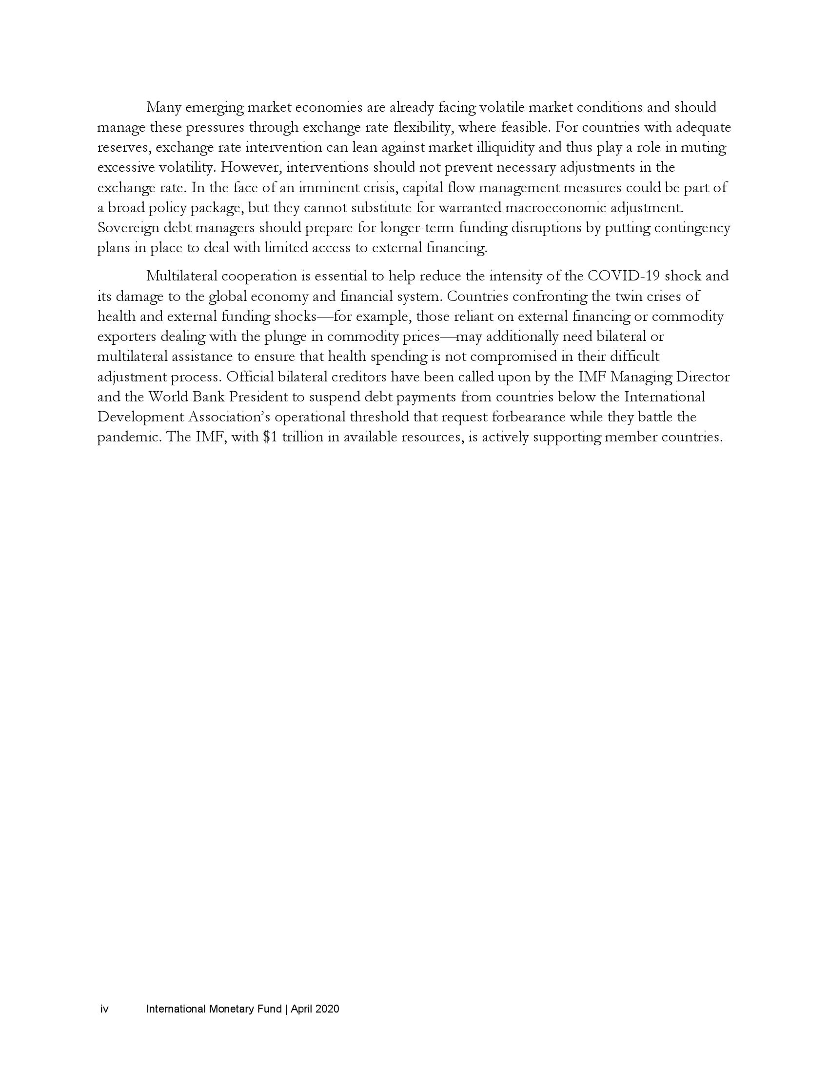 《报告》表示,国际货币基金组织总裁和世界银行行长已呼吁官方双边债权人对低于国际开发协会业务门槛且在对抗疫情期间请求提供债务延期的国家暂停偿债要求。国际货币基金组织具备一万亿美元的可用资源,正在积极为成员国提供支持。