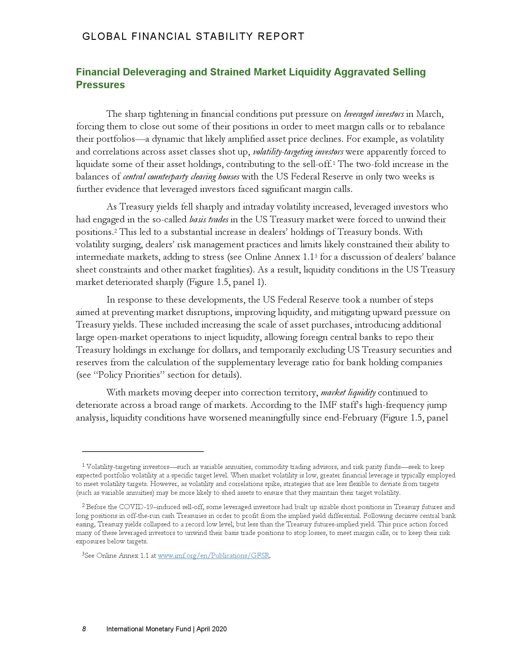 《报告》称,市场流动性显著恶化,包括传统上被视为深度较好的市场。杠杆投资者开始承压,据报道,部分投资者被迫将部分头寸平仓,以满足追加保证金的要求并进行投资组合再平衡。