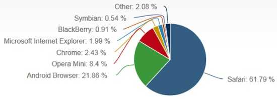 Net Applications数据显示,3月份Safari在全球移动浏览器市场的份额达到了61.79%,较2月份的55.41%高出6.38个百分点。