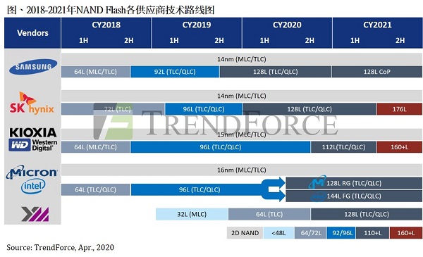 随着3D NAND Flash堆栈达到90层以上,主要供应商在更高层数蚀刻及堆栈技术的发展难度逐渐增加。观察各供应商的技术路线图,在1XX层的产品世代已有分歧:尽管三星(Samsung)、SK海力士(SK Hynix)已推出128层产品,但铠侠/西数(Kioxia/WD)、美光(Micron)、英特尔(Intel)的112/128/144层产品要到下半年才会放量,相比前几代3D NAND产品的发展进程来得更久,有利于长江存储的128层产品迎头赶上。