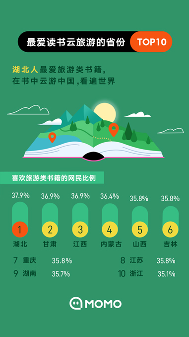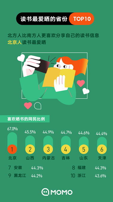读书可以将一个人的阅读趣味、阅读偏好、阅读感悟展露无疑。爱读书的人在社交平台更有魅力。陌陌报告显示,87.1%的网民对爱读书的人更有好感,认为才华比美貌、财富更增加好感度,而湖北人这一比例达95.5%,远高于全国其他省份。
