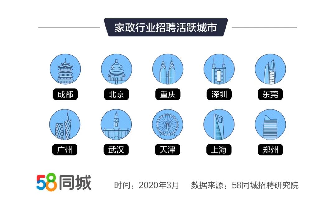 58同城招聘研究院数据还表明,今年3月,家政行业招聘活跃城市依次为成都、北京、重庆、深圳、东莞、广州、武汉、天津、上海、郑州。其中,重庆、武汉、天津企业招聘需求环比上升较快,环比增长超过200%,成都、东莞、广州企业招聘需求环比增长也达到100%以上。早在2月3日,成都家政服务行业协会就开始组织家政企业复工复产,使该市家政企业招聘需求较早释放。重庆拥有1.4万家家政服务企业,自3月24日该市应急响应级别从二级调整为三级后,家政企业招聘需求得到迅速释放,环比增幅位居全国前列。