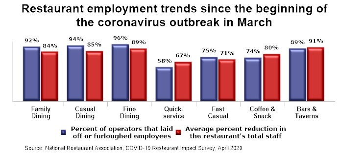 由于销售额下降,88%的餐厅经营者在疫情期间解雇或暂时解雇了员工。