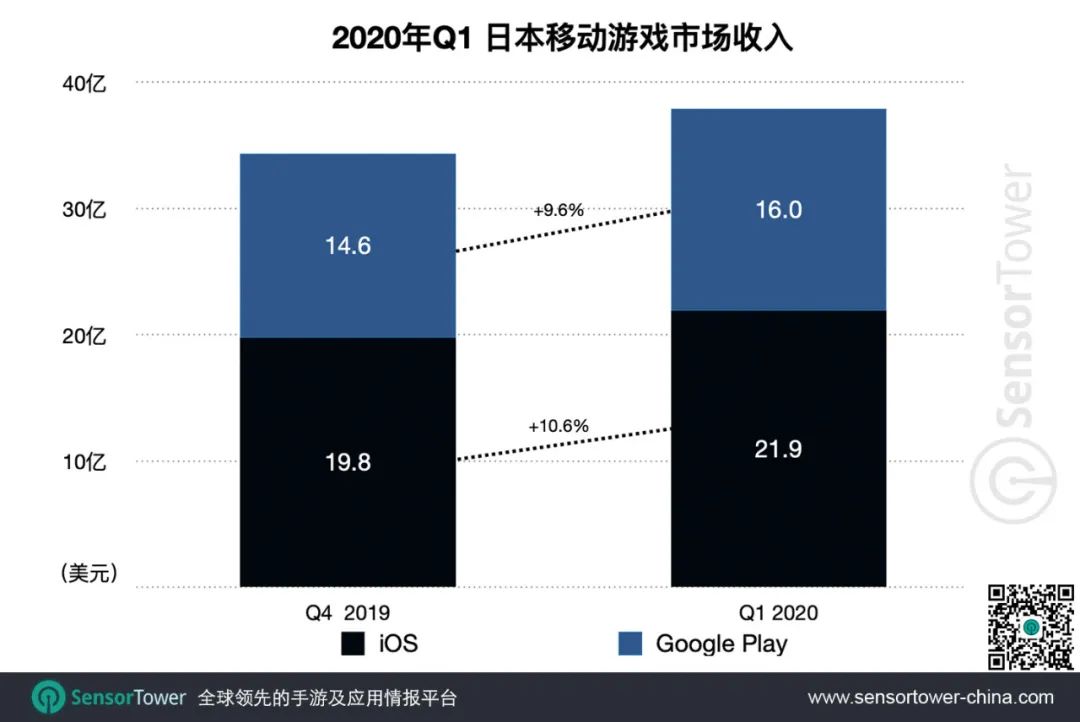 2020年Q1日本手游市场在App Store和Google Play的总收入为37.9亿美元,环比增长10.2%,与2019年Q1基本持平。其中,iOS收入占比为57.8%,Google Play收入占比为42.2%。