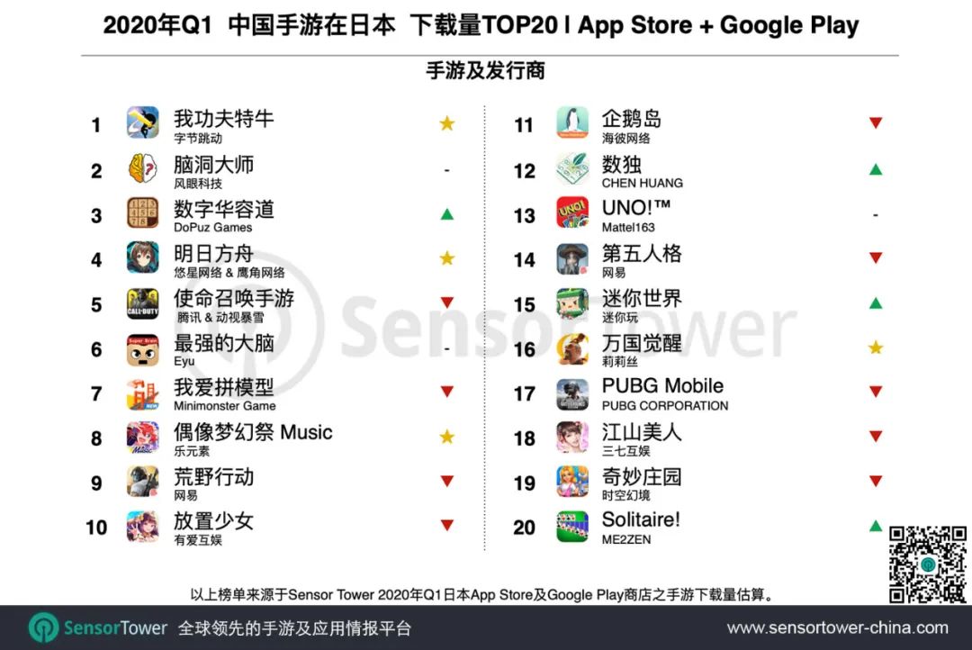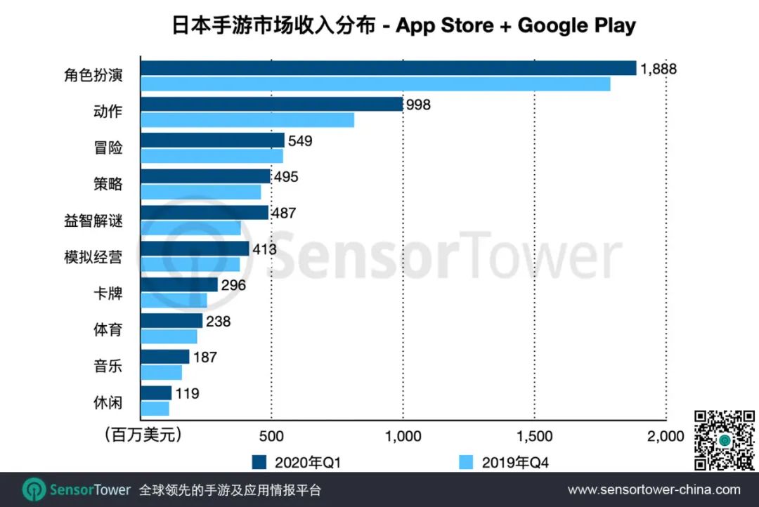 Sensor Tower 商店情报最新数据显示,2020年Q1日本手游市场收入将近38亿美元,环比增长10.2%;同时,入围畅销榜Top100的中国手游产品数量进一步增加至23款。详细数据如下。