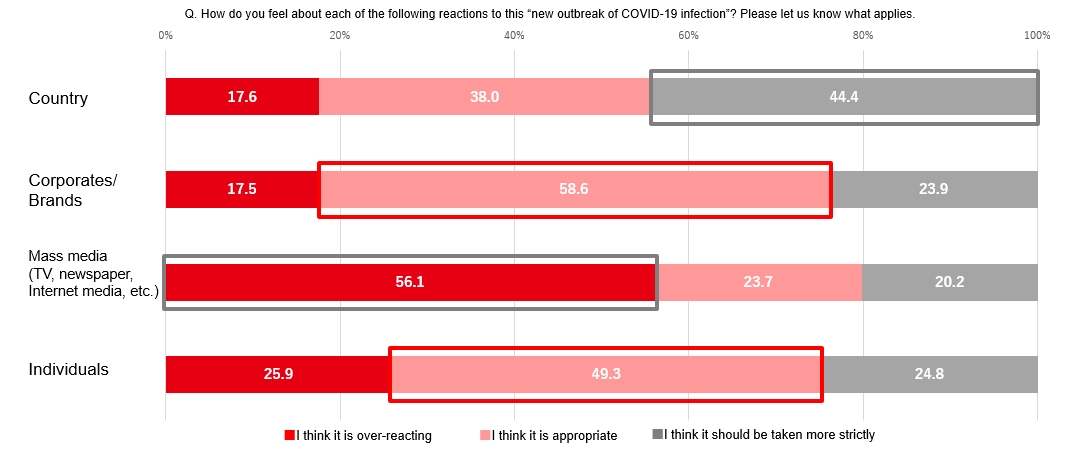 调查发现,44%的受访者认为国家应该采取更多措施来减轻病毒的影响;38%的受访者认为目前的措施是适当的。58%的受访者认为品牌对病毒的反应是适当的;28.3%的日本人认为自己做得不够。