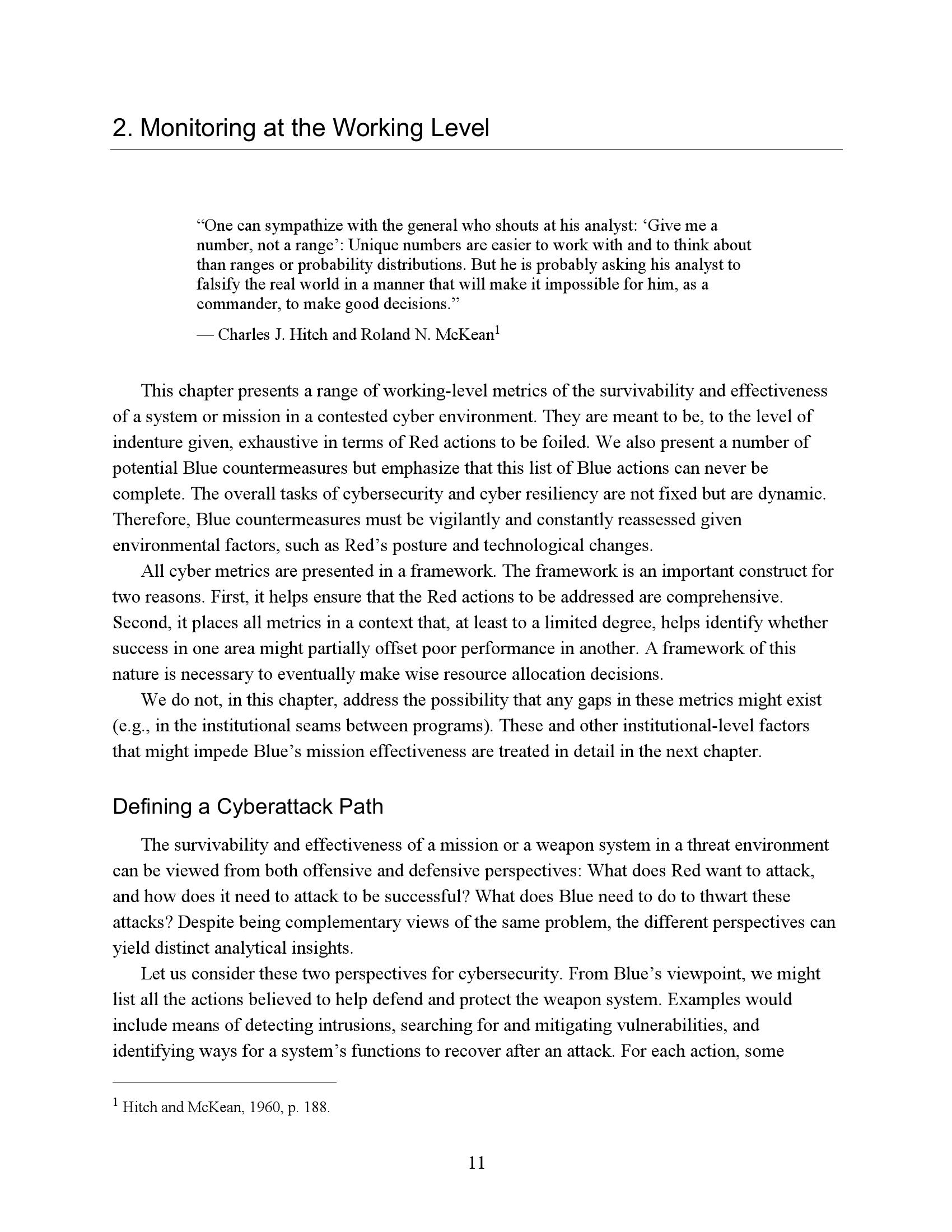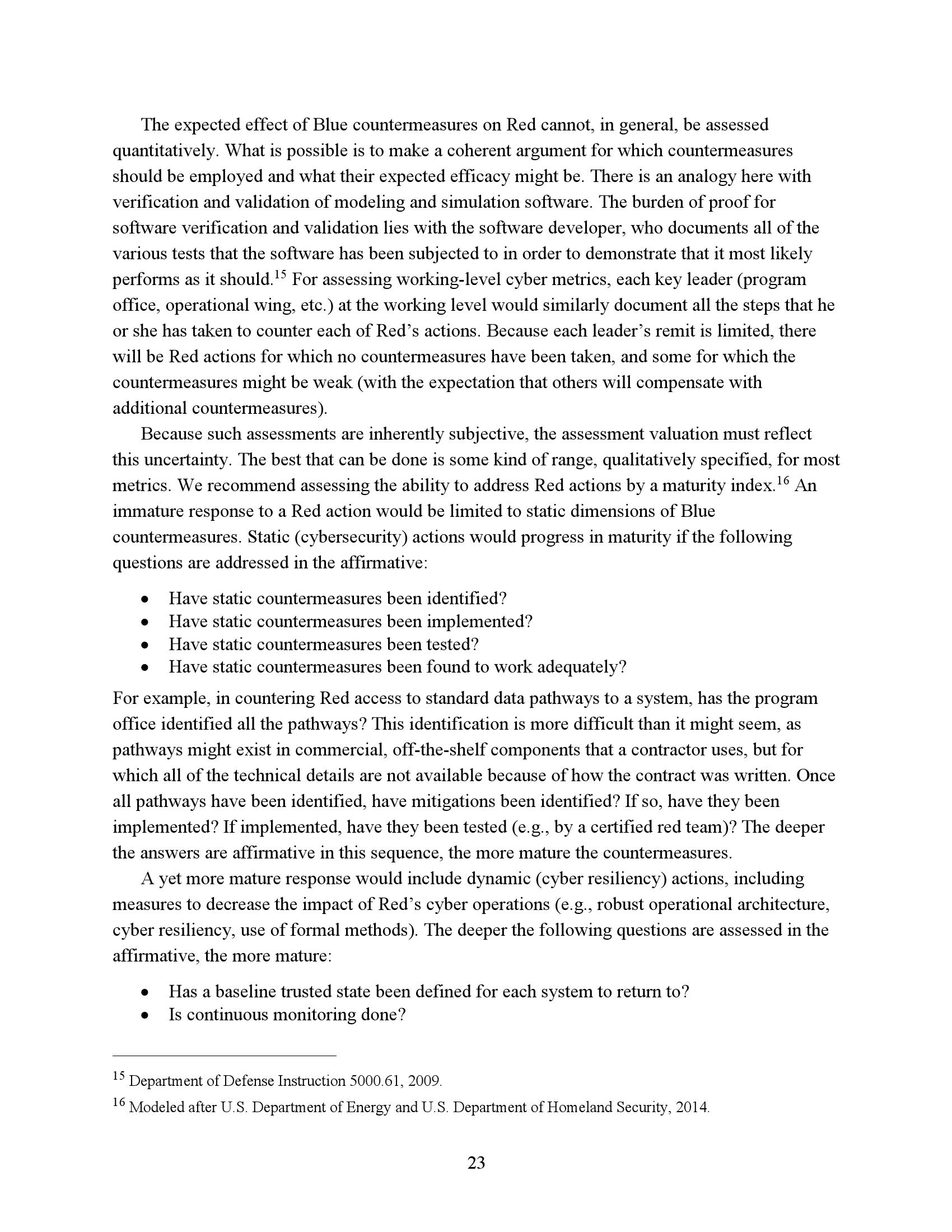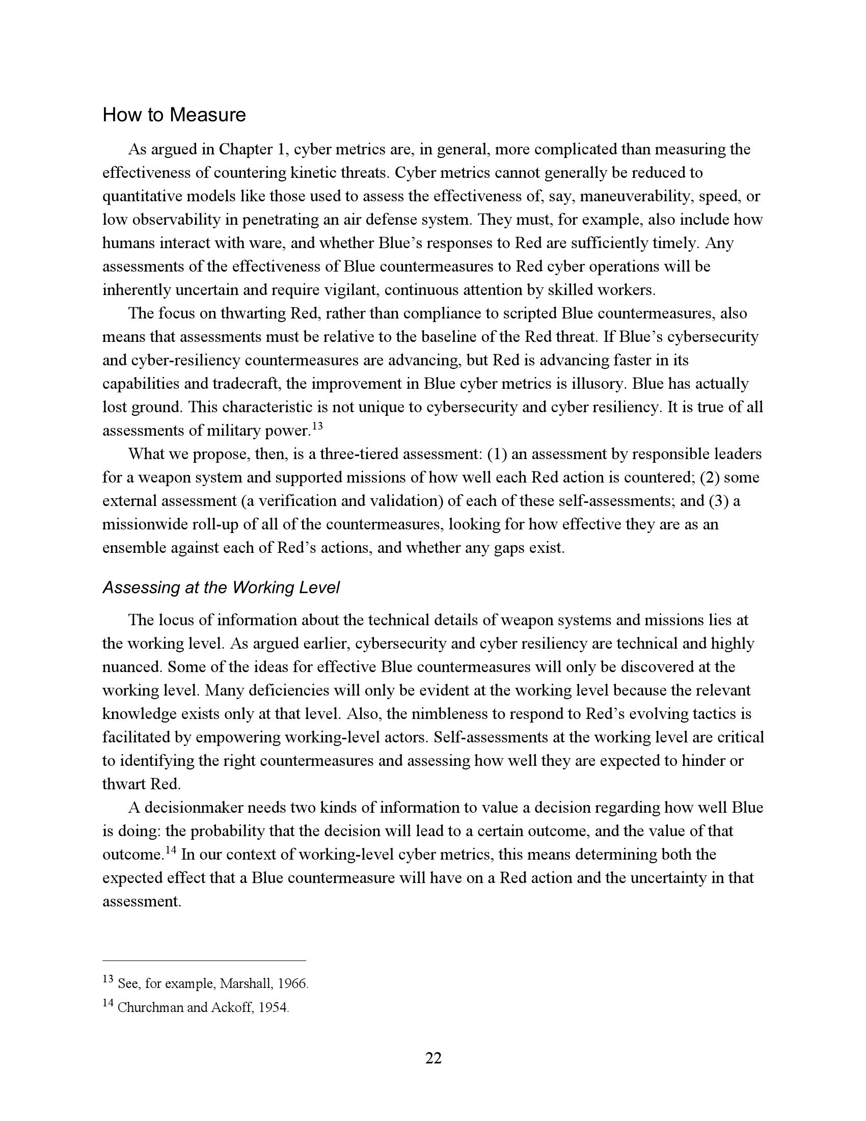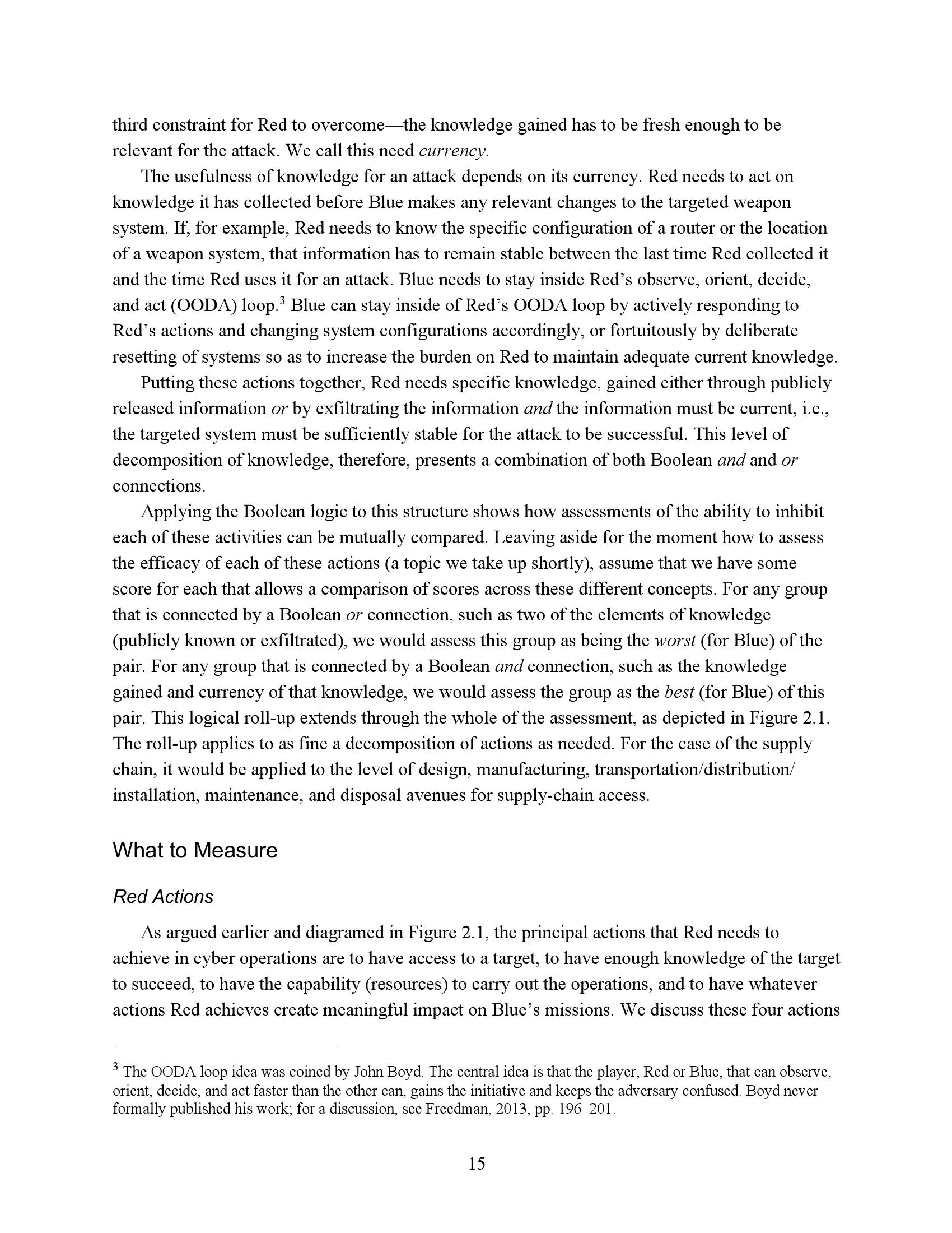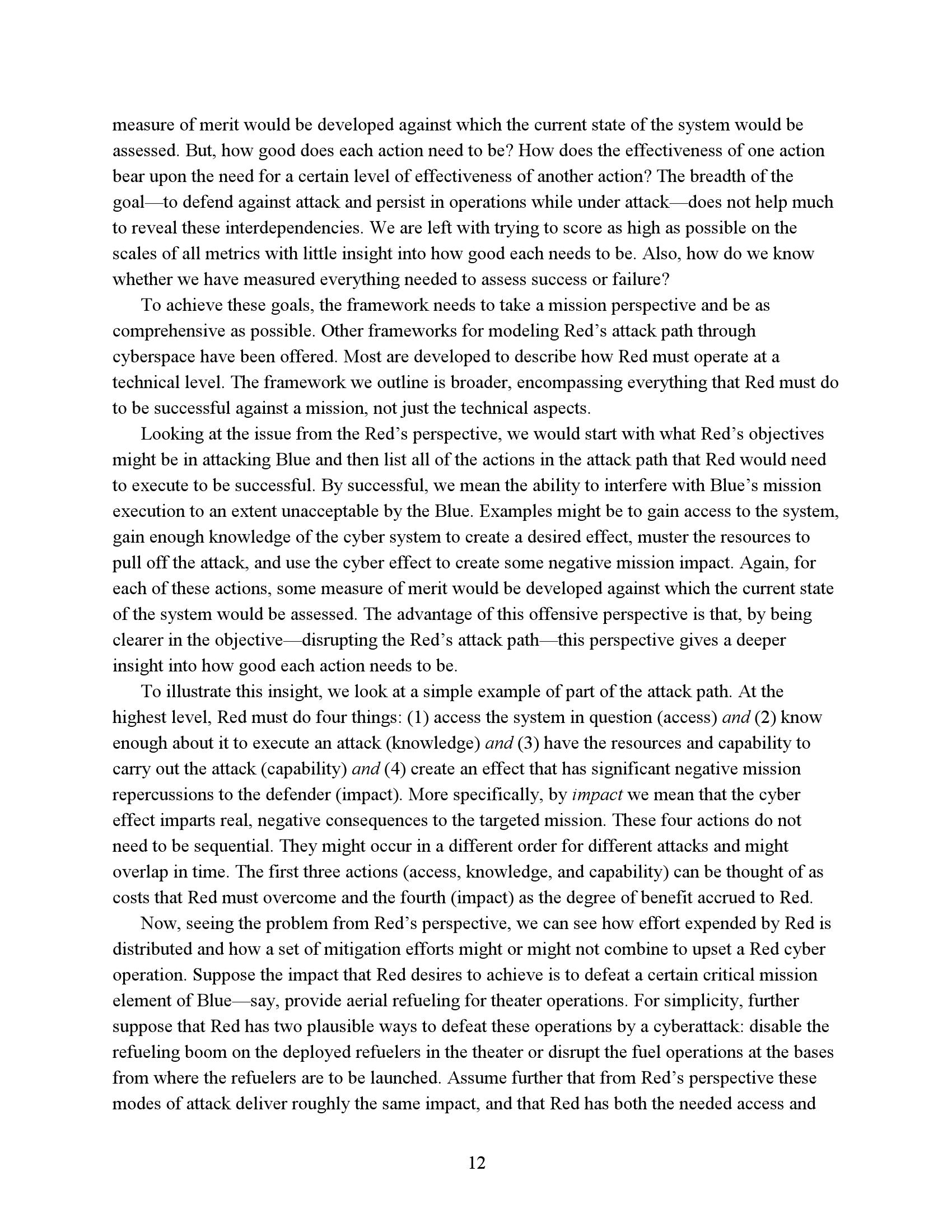 为了衡量一个任务或系统在网络竞争环境中的生存能力和有效性,我们必须了解R网络行动的反击程度。因此,网络度量的重点必须是估计R的成功或失败,而不是B可能尝试的具体对策。当然,B的反制措施很重要,但它们的重要性是作为一种手段来达到阻止或挫败R的目的。专注于符合B候选对策列表的网络指标无法表明这些措施是否有效、适当实施或足够全面以阻止R。因此,遵约办法是不够的。此外,不存在满足这些需求的“仪表板”形式的简单度量集。