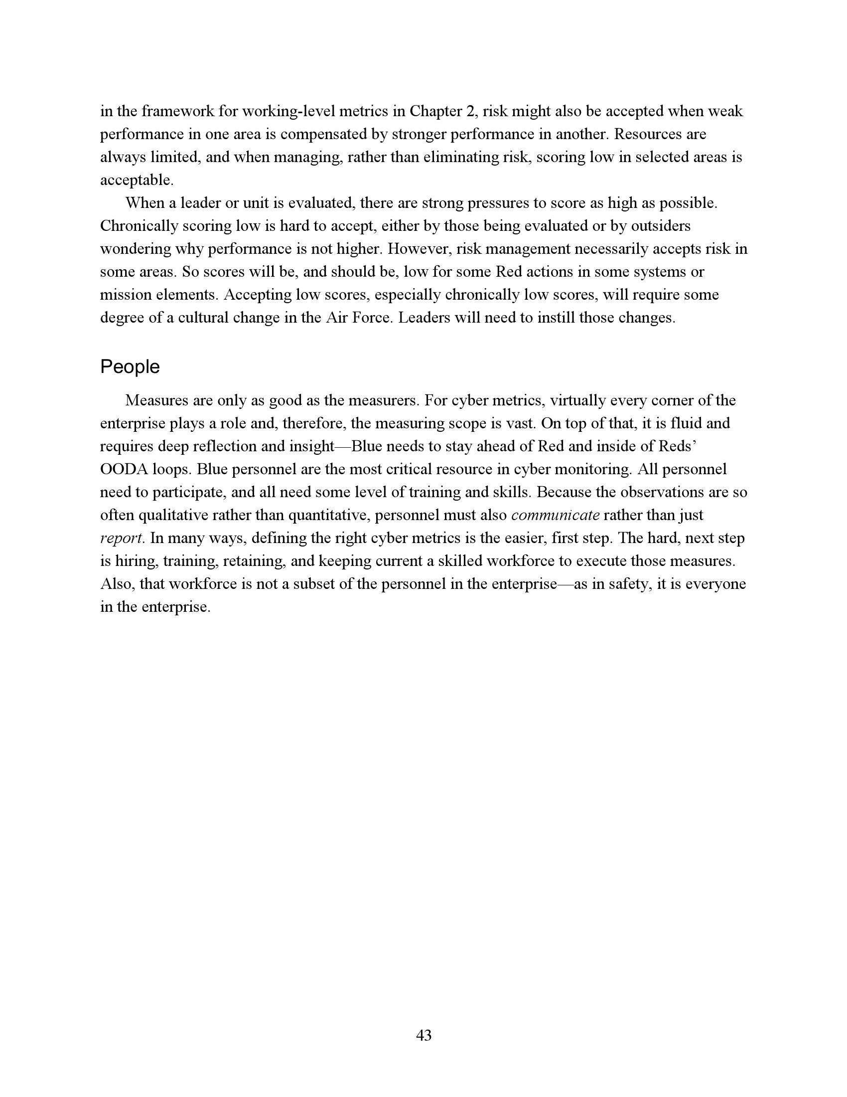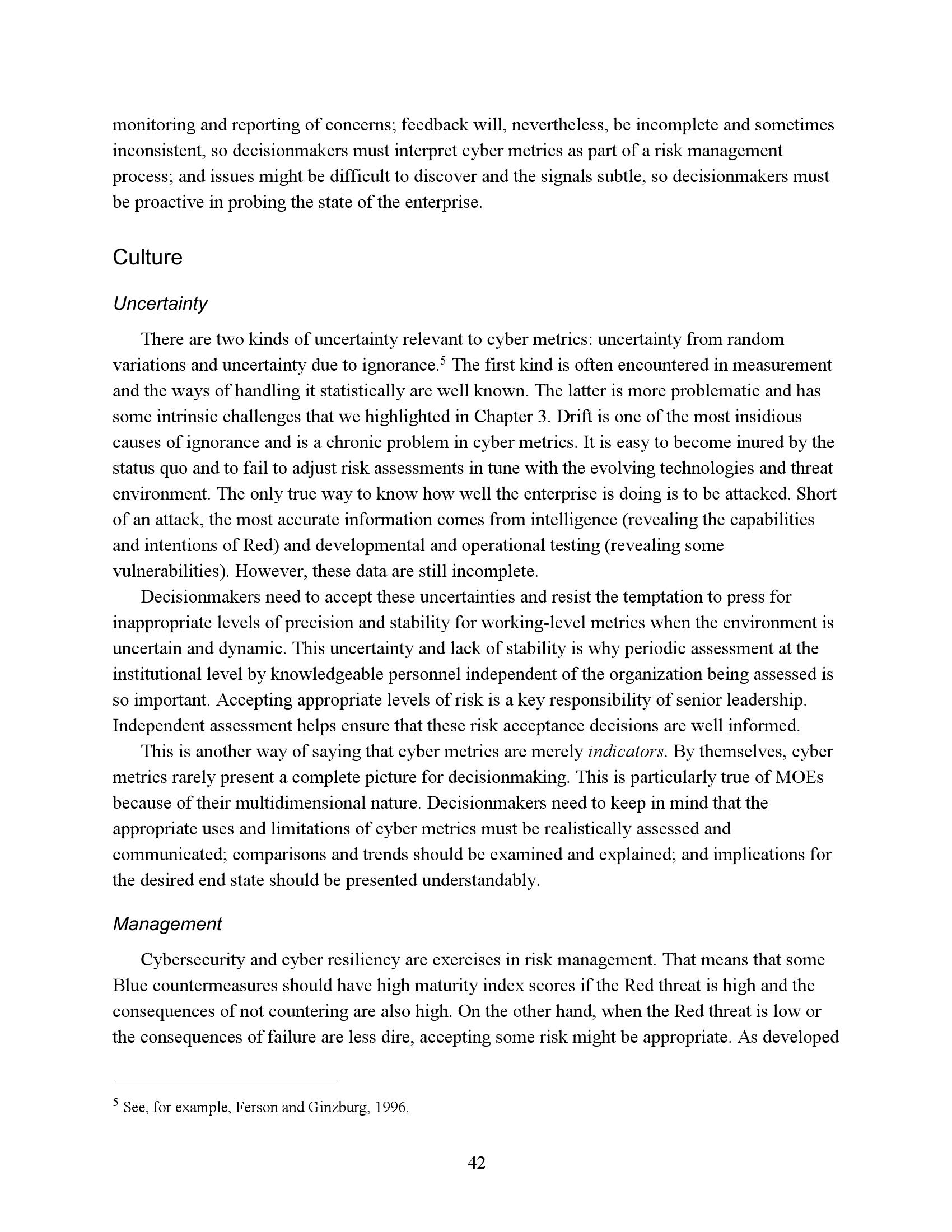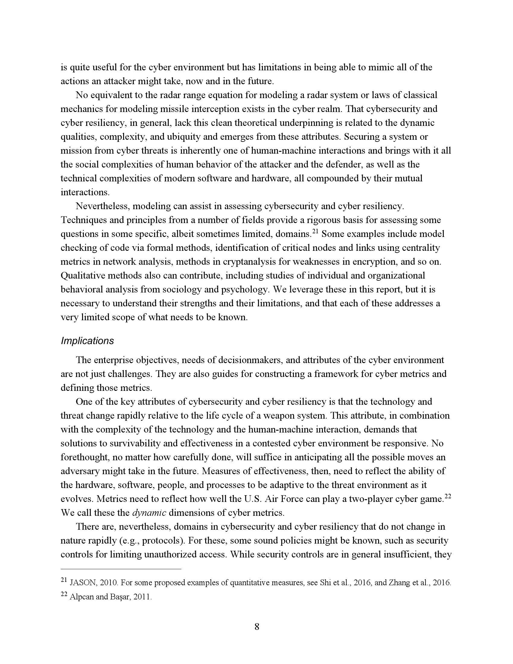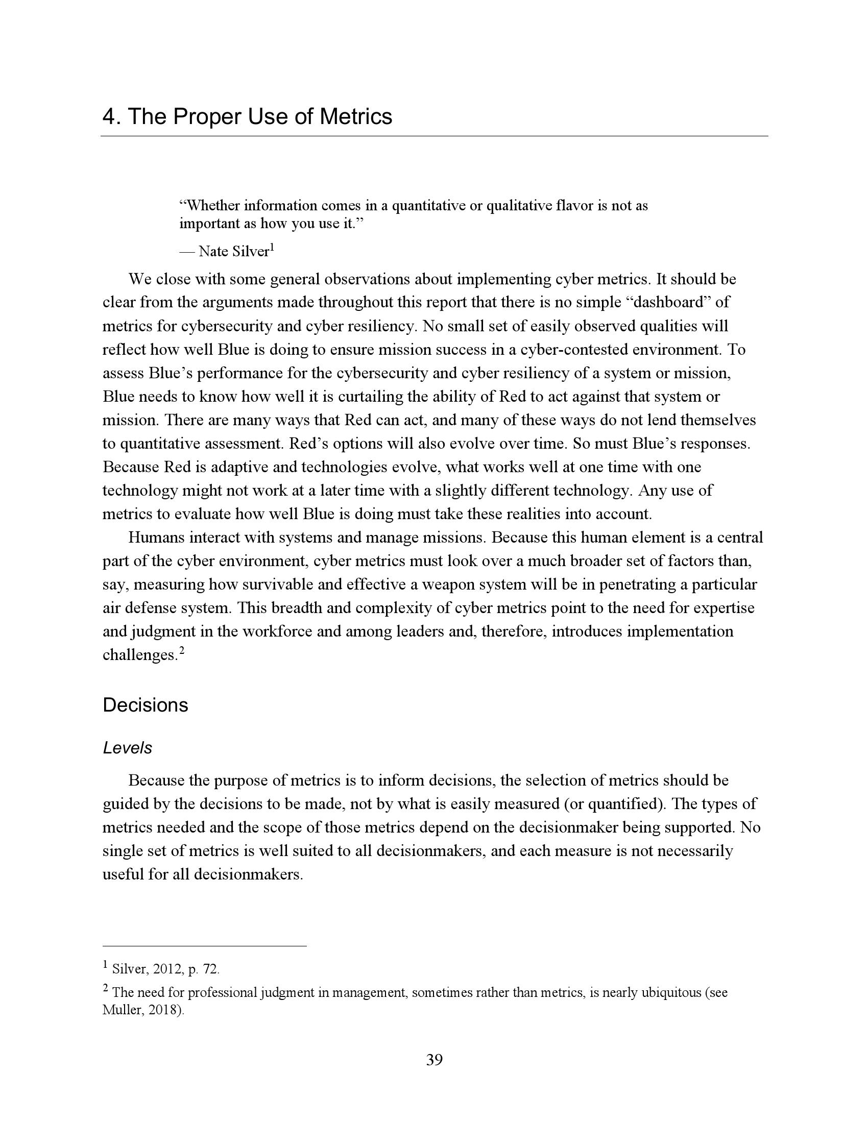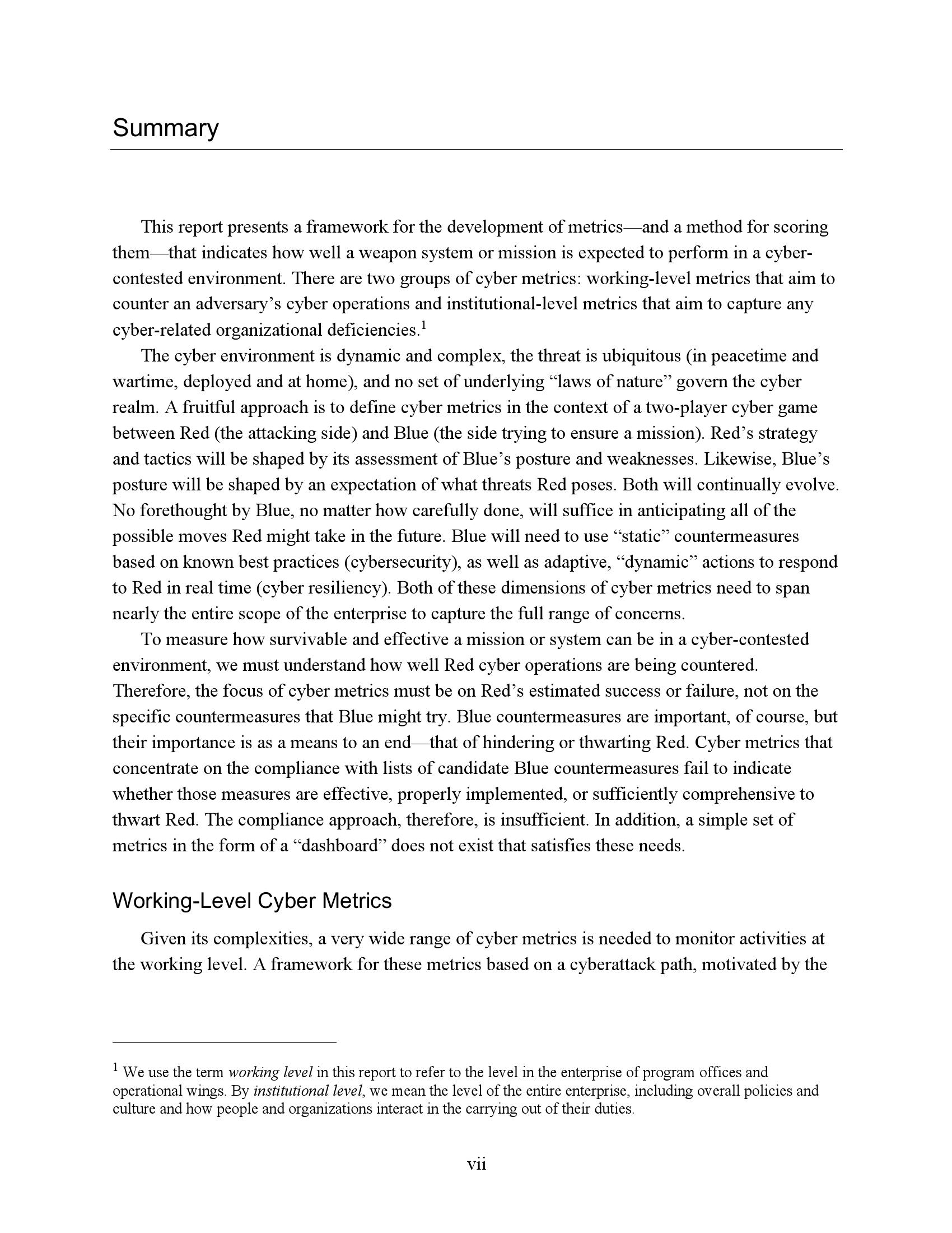 为了衡量一个任务或系统在网络竞争环境中的生存能力和有效性,我们必须了解R网络行动的反击程度。因此,网络度量的重点必须是估计R的成功或失败,而不是B可能尝试的具体对策。当然,B的反制措施很重要,但它们的重要性是作为一种手段来达到阻止或挫败R的目的。专注于符合B候选对策列表的网络指标无法表明这些措施是否有效、适当实施或足够全面以阻止R。因此,遵约办法是不够的。此外,不存在满足这些需求的“仪表板”形式的简单度量集。