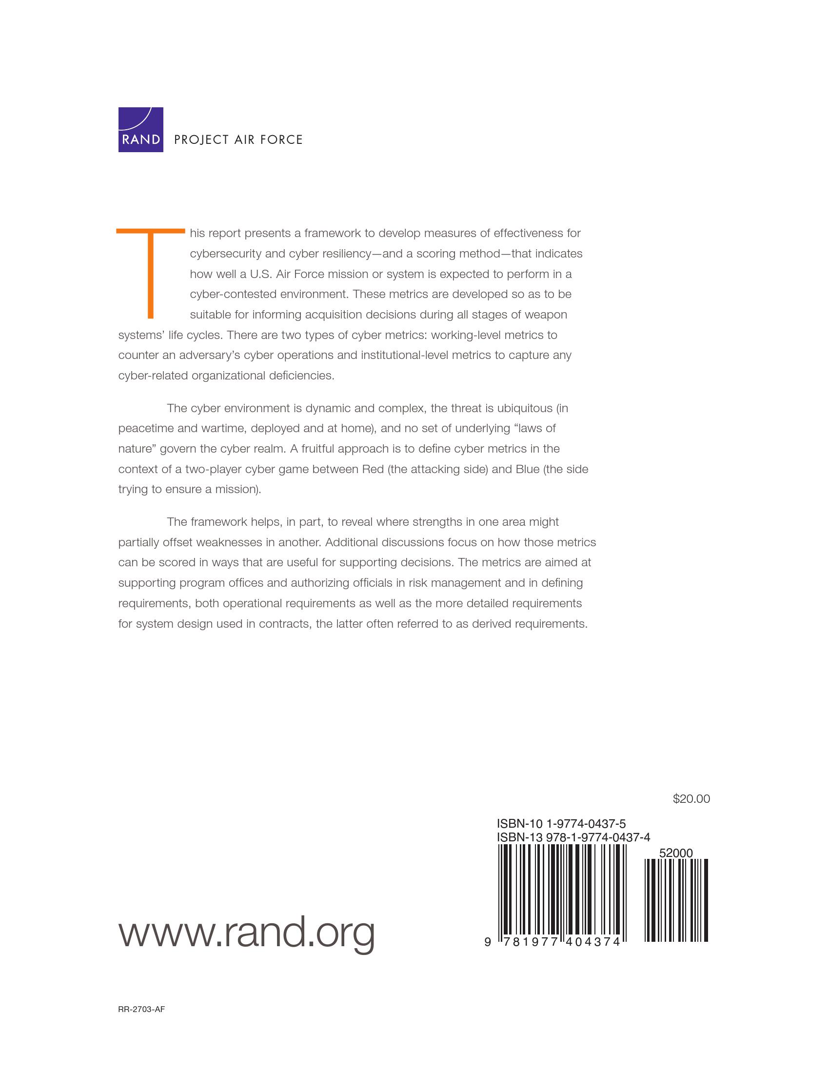 该报告提出了可以用来衡量美国空军任务或系统在网络竞争环境中表现的指标框架和评分方法。这些度量标准的开发是为了在武器系统全生命周期阶段都能够随时提出并通知采办进行决策。报告主要提到了两种类型的网络指标:用于与对手网络行动进行对抗的工作级指标和用于捕获网络组织缺陷的制度级指标。这份报告以红蓝方兵棋推演的方式,为大家呈现了网络攻击中持续监测网络弹性的重要性。