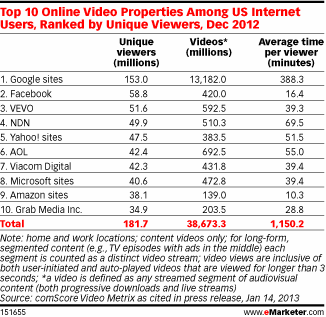 YouTube的独特性和其易于与其他平台整合造就了其统治地位。eMarketer估计美国网络视频用户数量将在2013年增长6%,到1.825亿用户。