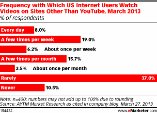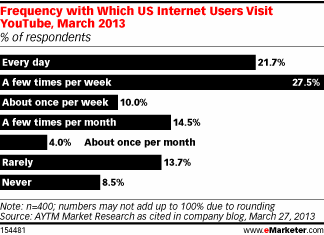 AYTM市场研究公司发现,2013年3月份,美国60%的网民每周至少访问一次YouTube,其中22%每天都访问YouTube,将近30%一周访问YouTube几次。
