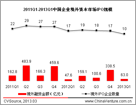 2013年第一季度,A股IPO停滞且无明确重启时间表,美股IPO窗口持续关闭,中企IPO陷入“极度深寒”态势,数量及融资金额均创下2009年IPO重启以来的新低。根据ChinaVenture投中集团旗下金融数据产品CVSource统计显示,2013年一季度,仅有10家中国企业完成IPO,且均上市于香港市场,合计融资63亿元,环比减少83%,同比减少84%。本季度上市企业中,仅一家具有VC/PE背景,而在IPO退出受阻的形势下,并购退出已成为VC/PE投资主流退出方式。