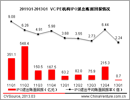 图8 2011Q1-2013Q1 VC/PE机构IPO退出账面回报情况