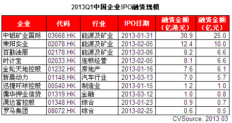 表1 2013Q1中国企业IPO融资规模