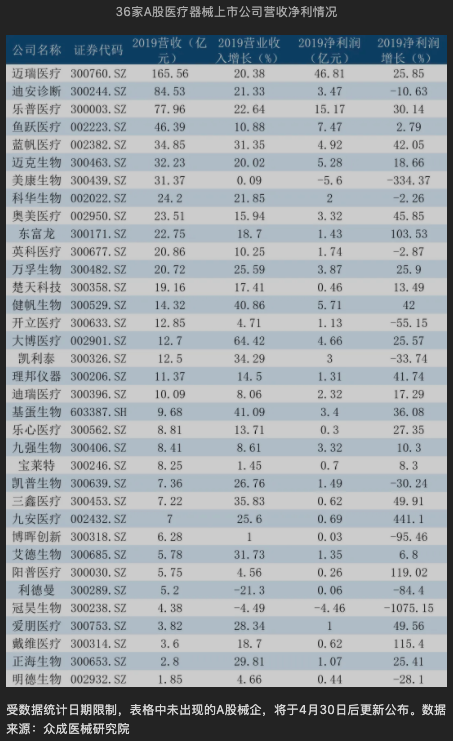 本文整合了国内已经公布的36家医疗器械上市公司2019年报,通过数据了解国内医疗器械公司的生产与营收情况。