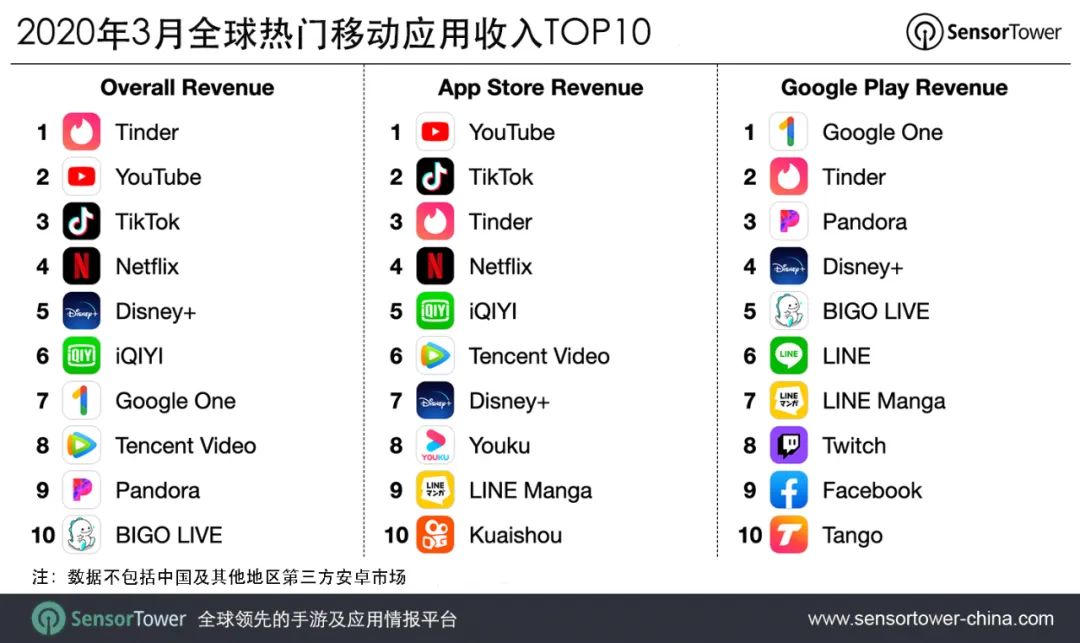 Sensor Tower:2020年3月全球热门移动应用收入TOP10 Sensor Tower 商店情报数据显示,2020年3月交友应用Tinder全球吸金超过7680万美元,位列全球移动应用收入榜冠军。美国是该应用收入第一大市场,占41%;其次为英国和德国,分别占7%和5%。全球热门移动应用收入Top10完整榜单请见上文图表。 YouTube以7540万美元的收入,位列榜单第二名,较去年同期增长47%。美国用户贡献了收入的58%,其次为日本用户,占9%。 榜单前五名另外三款应用为抖音及海外版TikTok,Netflix,以及Disney+。 更多阅读:Sensor Tower:2021年1月全球热门移动应用收入TOP10Sensor Tower:2020年11月全球热门移动应用收入TOP10Sensor Tower:2021年2月全球热门移动应用收入TOP10Sensor Tower:2020年10月全球热门移动应用收入TOP10Sensor Tower:2022年4月全球热门移动应用收入TOP10Sensor Tower:2020年7月全球热门移动应用收入TOP10Sensor Tower:2022年1月全球热门移动应用收入TOP10Sensor Tower:2022年7月全球热门移动应用收入TOP10Sensor Tower:2022年6月全球热门移动应用收入TOP10Sensor Tower:2022年2月全球热门移动应用收入TOP10Sensor Tower:2022年10月全球热门移动应用收入TOP10SensorTower:2020年9月全球热门移动应用收入TOP10Sensor Tower:2022年6月全球热门移动应用下载TOP10Sensor Tower:2021年全球书籍类应用收入排行榜Sensor Tower:2022年9月全球热门移动应用下载TOP10