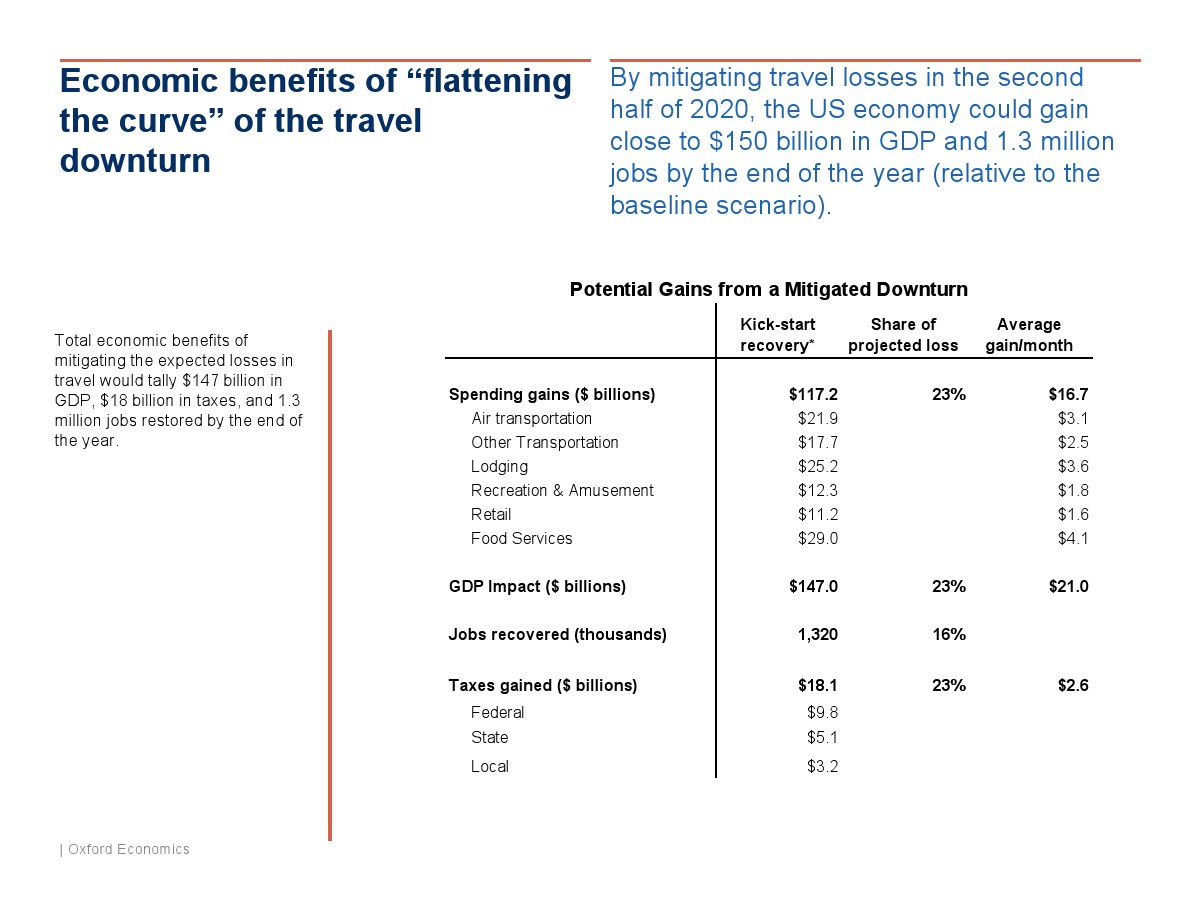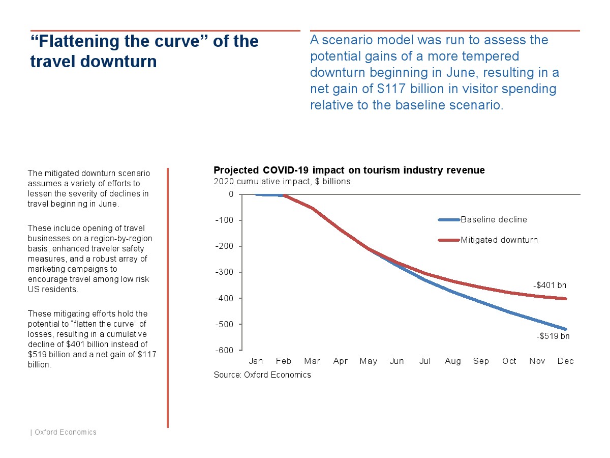 缓和的低迷情景假设从6月份开始采取各种努力来缓解旅行下降的严重程度。这些措施包括按地区开设旅游业务,加强旅行者安全措施,以及一系列强有力的营销活动,以鼓励低风险的美国居民旅行。