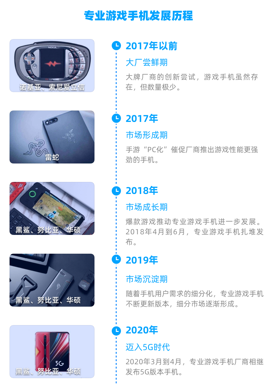 游戏手机的诞生是基于人们的娱乐需求。早在1993年,就已经有手机开始配置一些简单的游戏,比如贪吃蛇、俄罗斯方块等。到了2017年,随着手机游戏行业的飞速嬗变,无论是硬件厂商还是手机厂商都开始探索游戏手机市场,比如游戏设备品牌雷蛇发布的Razer phone一经上市,大受好评。2018年,在王者荣耀、刺激战场等爆款手游的造势下,黑鲨、红魔、ROG等一系列专业游戏手机相继问世,专业游戏手机市场份额快速增长。2019年,专业游戏手机不断更新版本,用户体量得到进一步积累。2020年,随着黑鲨3、红魔5G版本的发布和上市,专业游戏手机正式迈入5G时代。