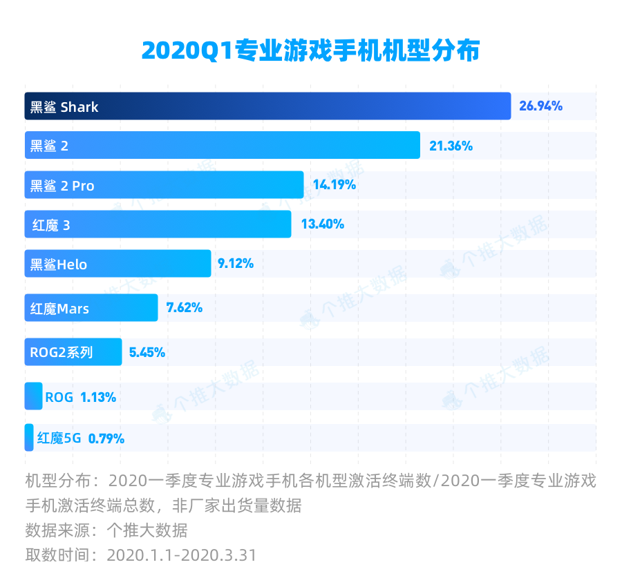 从2020年一季度专业游戏手机机型分布情况来看,前三名均被黑鲨手机占领。其中,2018年4月上市的国内第一款专业电竞手机黑鲨SHARK以26.94%的占有率排名第一,2019年面世的黑鲨2以21.36%的占有率排名第二,黑鲨2 Pro以14.19%的占有率排名第三。