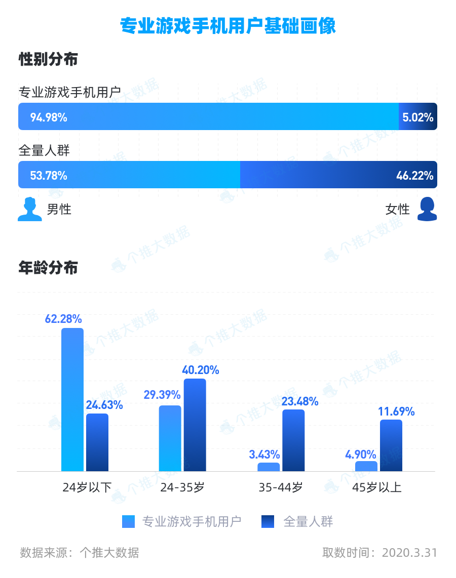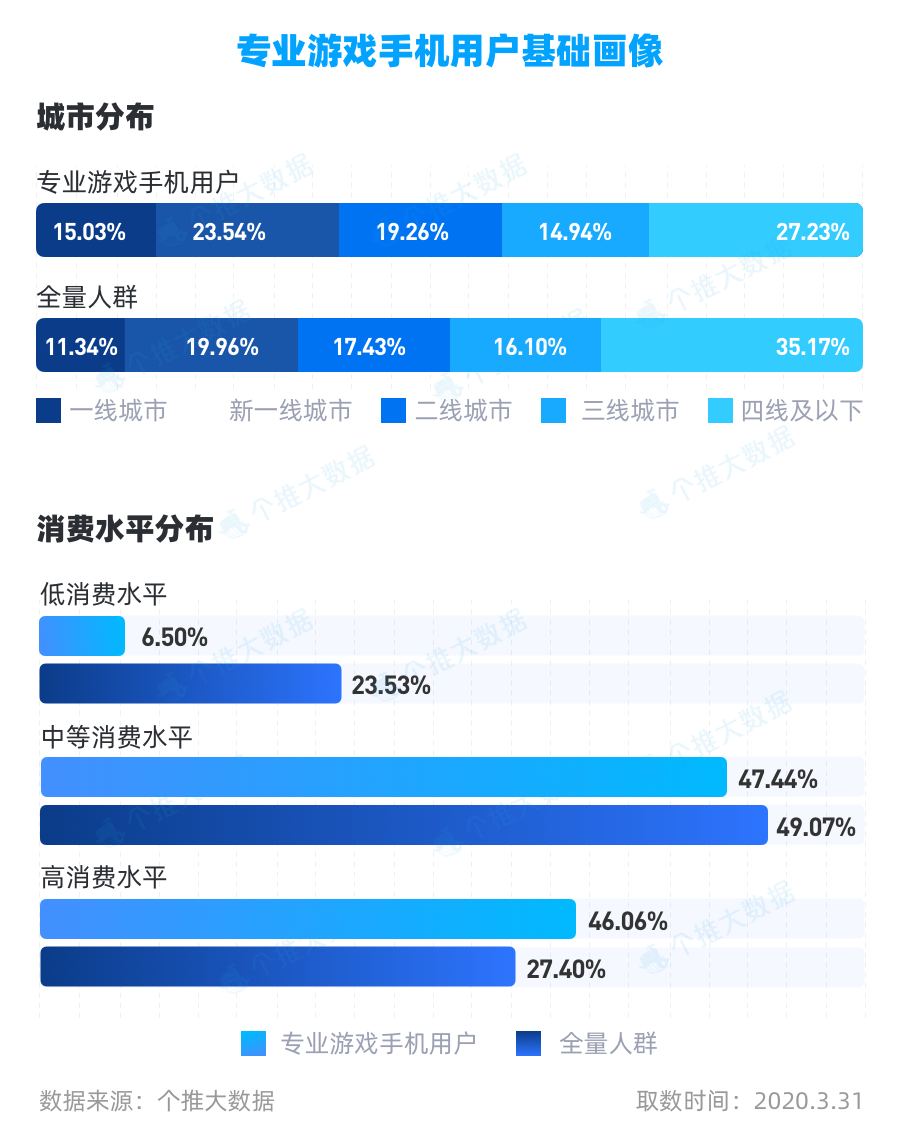每日互动个推大数据将专业游戏手机用户画像和全量人群用户画像进行了对比,以此来洞察游戏手机的人群特征。