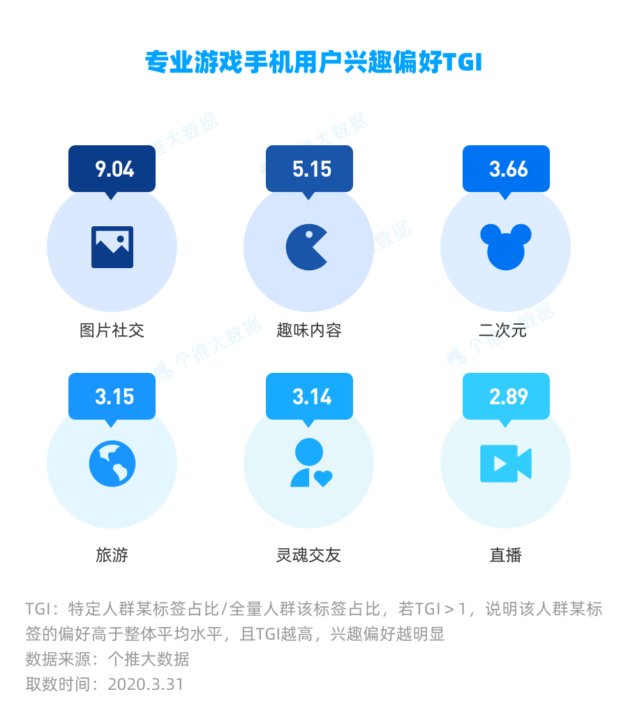 数据显示,专业游戏手机用户在图片社交、趣味内容、二次元、旅游、灵魂社交、直播的兴趣偏好TGI都比较高,体现出年轻化的特征。