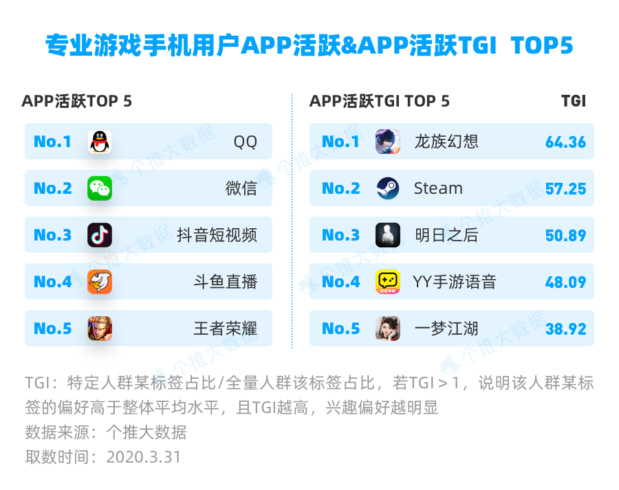 此外,每日互动个推大数据也关注了专业游戏手机用户APP的活跃情况。数据显示,专业游戏手机用户活跃排行前五中,斗鱼直播、王者荣耀纷纷上榜。专业游戏手机用户APP活跃TGI排行前五中,上榜的游戏都有着十分精良的制作,对手机的性能要求也相对较高。比如TGI排名第一的龙族幻想采用了不少领先行业的全新技术,游戏玩家们会更愿意选择游戏手机来提升游戏体验。此外,排名第二的Steam是知名在线游戏平台,排名第四的YY手游语音也是热门游戏辅助APP。
