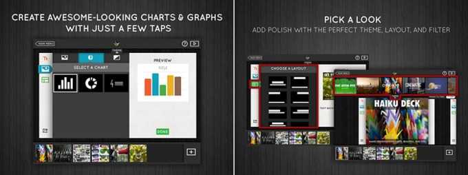 Haiku Deck 内配备了幻灯片模板,并附了很精美的配图。除此之外,你还可以依据关键词来搜索背景图或是用自己相册内的图片。它的图表编辑做得也很简单,支持柱状图和扇形图,输出数据即可出图,或拉长及缩短各块柱型来调整数据。它功能并没传统制作工具如 PowerPoint 那样强大,但可以让你在很短时间内就做出好看的幻灯片。