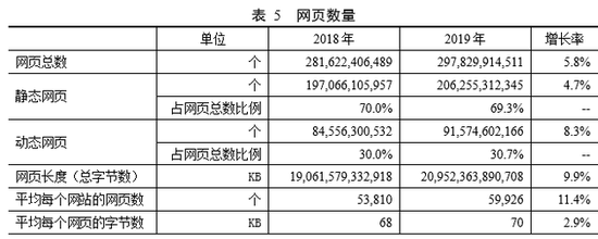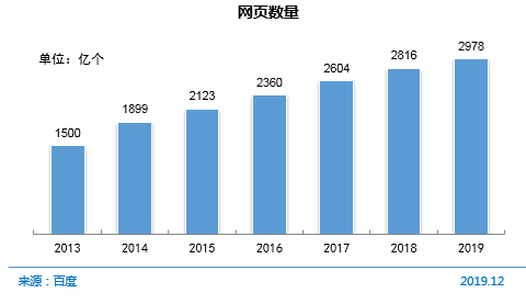 截至2019年12月,我国网页数量为2978亿个,较2018年底增长5.8%。