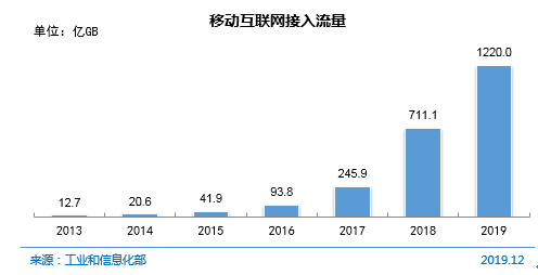 2019年1至12月,移动互联网接入流量消费达1220.0亿GB。