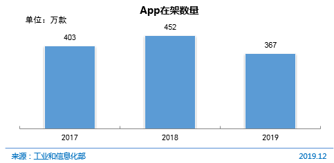 截至2019年12月,我国国内市场上监测到的App(Application,移动互联网应用)数量为367万款,比2018年减少85万款,下降18.8%。