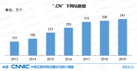 截至2019年12月,“.CN”下网站数量为341万个,较2018年底增长4.6%。
