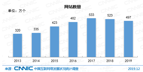 截至2019年12月,我国网站数量为497万个,较2018年底下降5.1%。