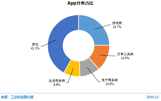 截至2019年12月,移动应用规模排在前四位种类(游戏、日常工具、电子商务、生活服务类)的App数量占比达57.9%。其中,游戏类App数量达90.9万款,占全部App比重为24.7%,较2018年减少47.4万款;日常工具类、电子商务类和生活服务类App数量分别达51.4万、38.8万和31.7万款,分列移动应用规模第二、三、四位,占全部App比重分别为14.0%、10.6%和8.6%,其他社交、教育等10类App占比为42.1%。