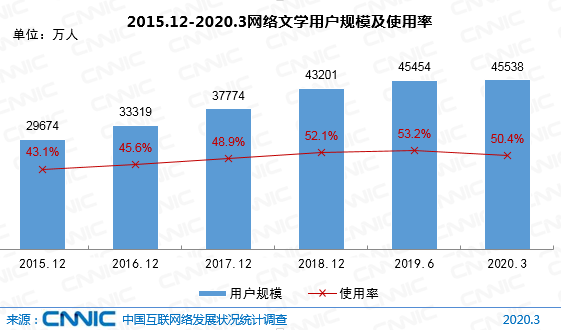 截至2020年3月,我国网络文学用户规模达4.55亿,较2018年底增长2337万,占网民整体的50.4%;手机网络文学用户规模达4.53亿,较2018年底增长4238万,占手机网民的50.5%。