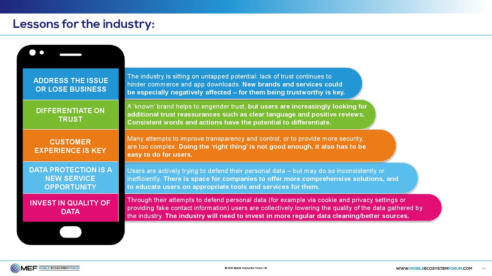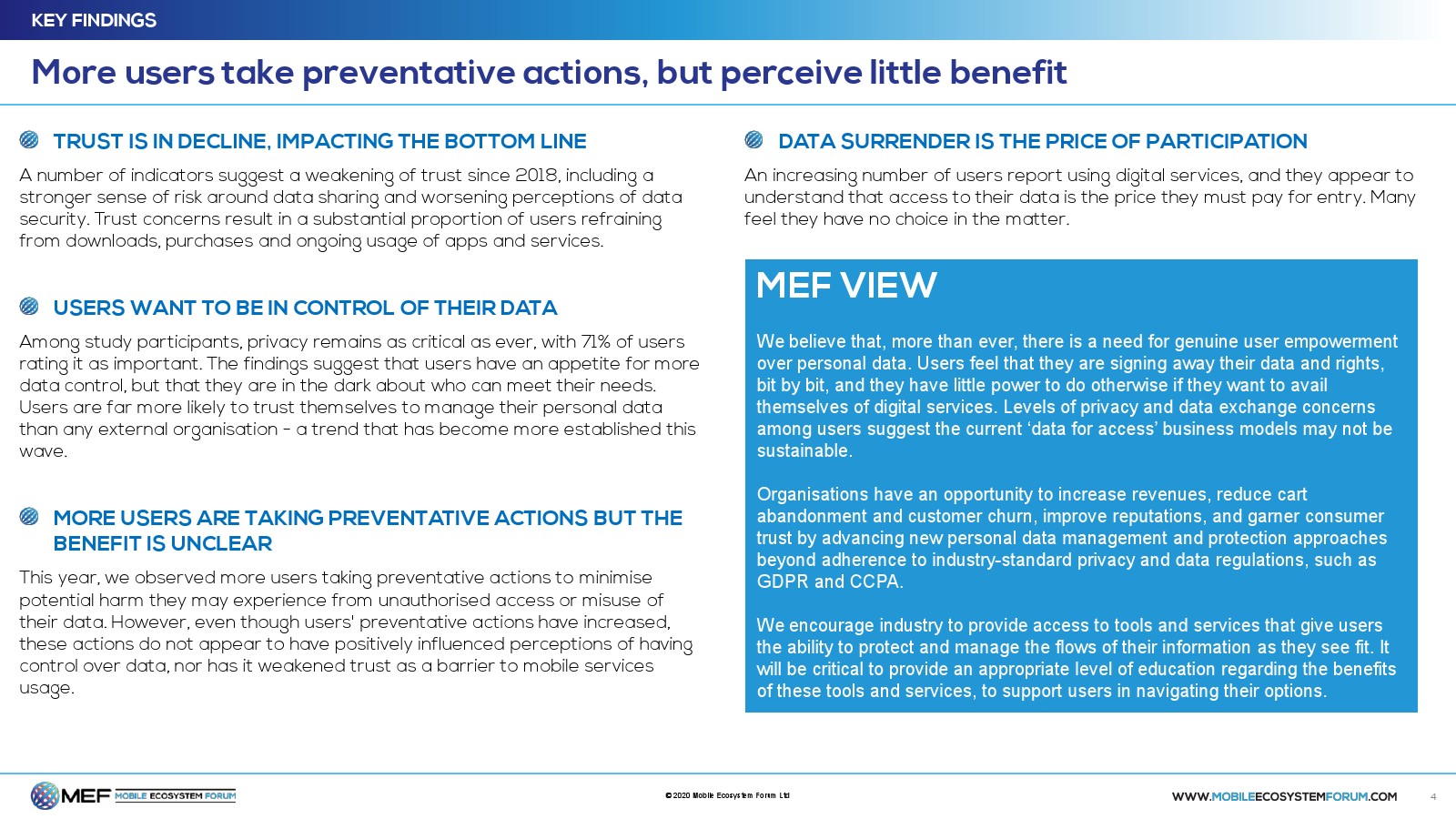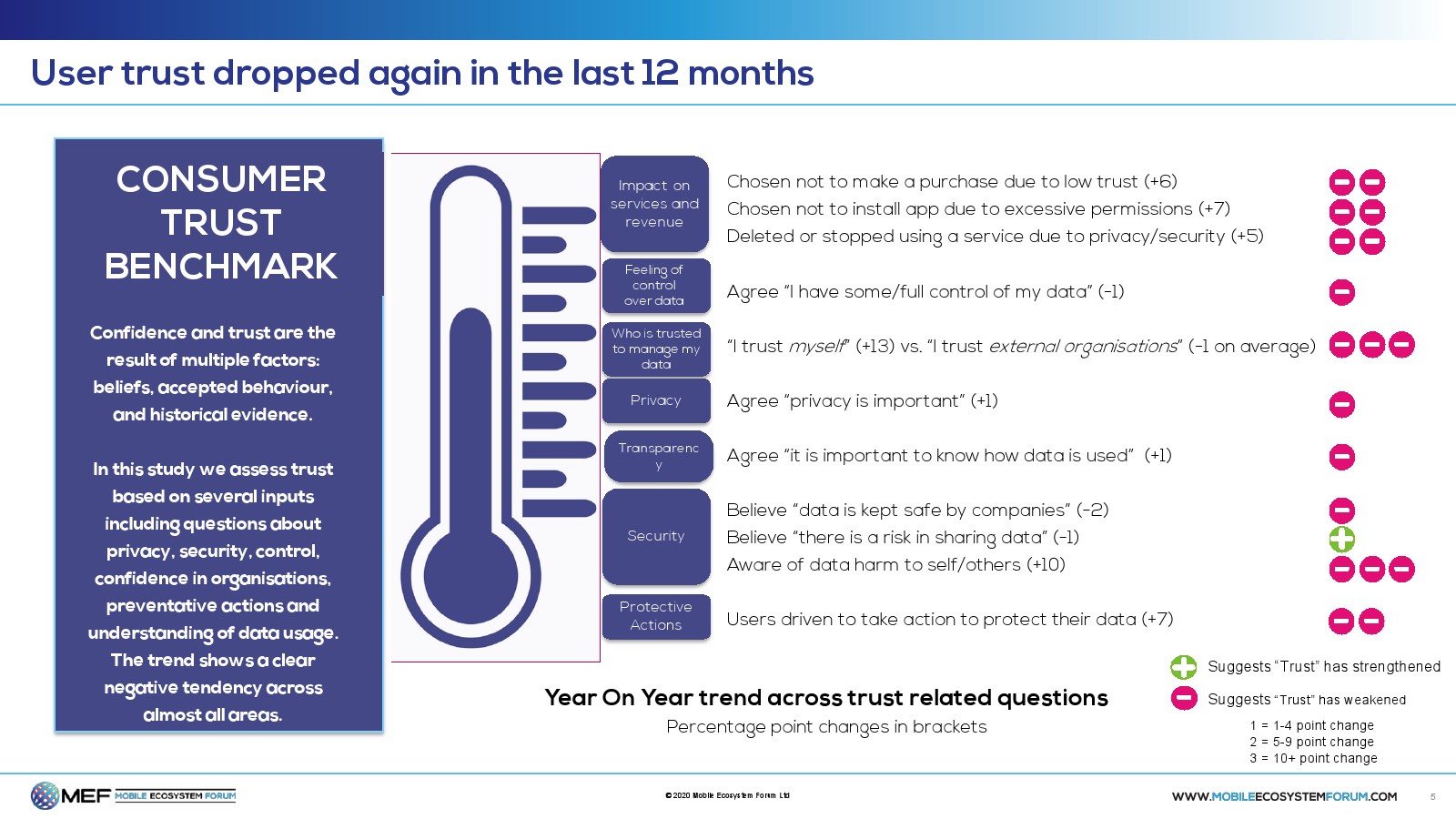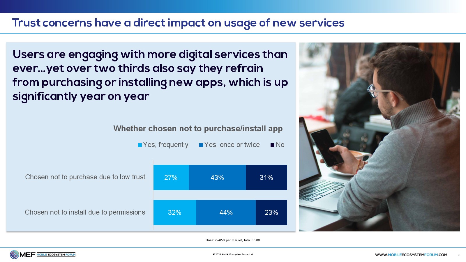 尽管全球智能手机应用下载量持续增长,但也有一些用户选择不购买或不安装应用,以努力控制个人数据。移动生态系统论坛(MEF)关于全球消费者信任的年度报告显示,全球70%的智能手机用户至少有一次因信任度低而没有购买某个应用;约3/4的用户(76%)出于权限原因选择了不安装应用。