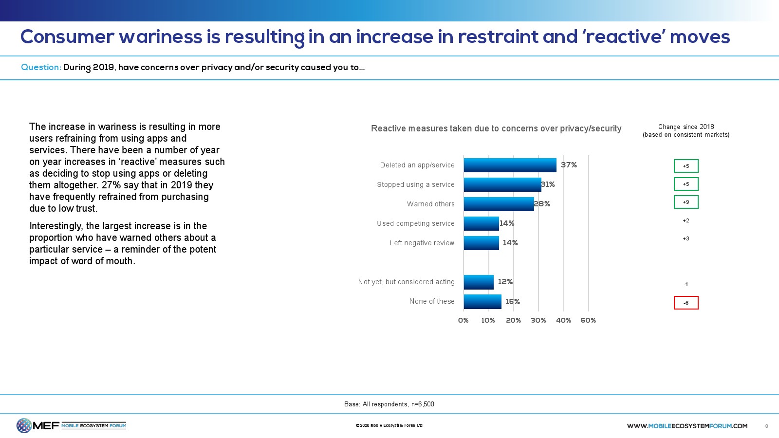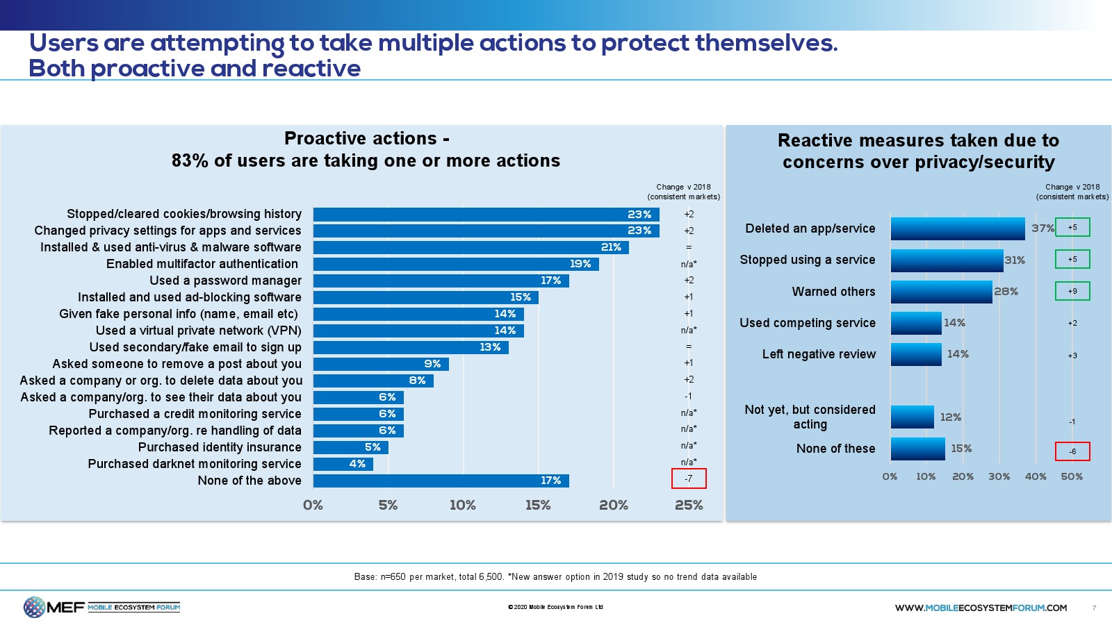 对于那些担心自己隐私或安全的受访者,一些人采取了反应性措施,包括删除应用/服务(37%)、停止使用服务(31%)、警告他人(28%)、使用竞争对手的服务(14%)或留下负面评论(14%)。