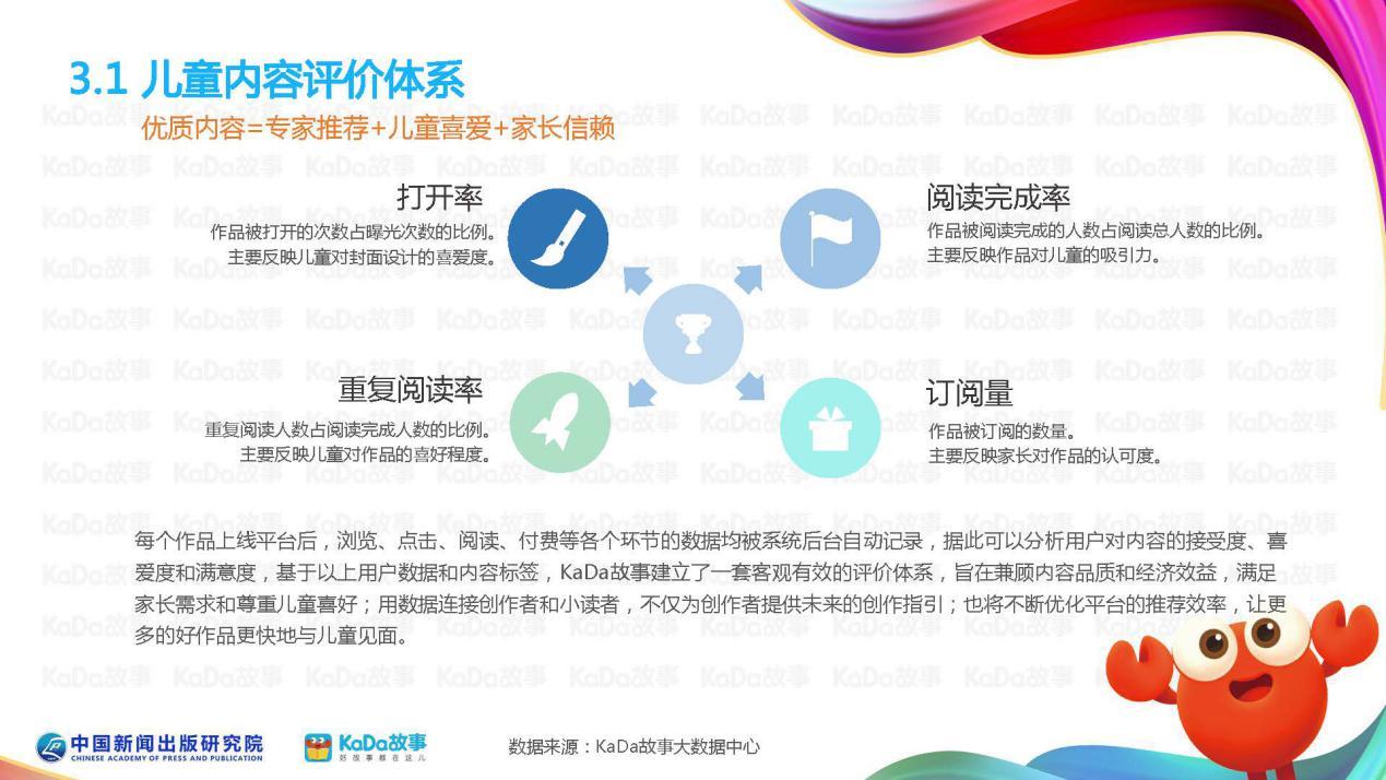 为了尊重每个孩子的阅读需求,报告在业内首次提出“儿童内容评价体系”,这套体系依托KaDa故事平台50亿条阅读数据生成,从作品打开率、阅读完成率、重复阅读率、订阅量四个维度综合分析儿童的阅读需求和偏好,不断筛选优质阅读内容,确保内容品质。