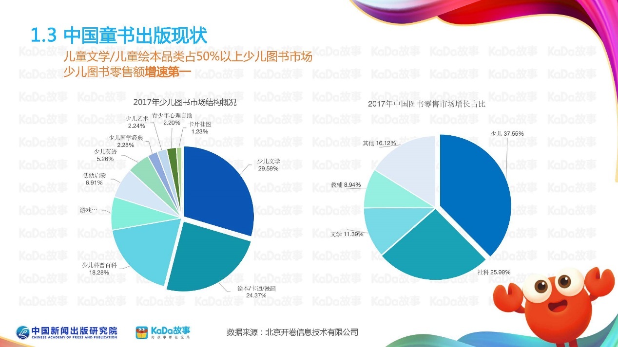 从报告数据来看,近些年来少儿读物品种高速增长,2018年码洋占比图书行业达24.64%。此外,儿童文学、儿童绘本依旧占据少儿图书市场的半边天。