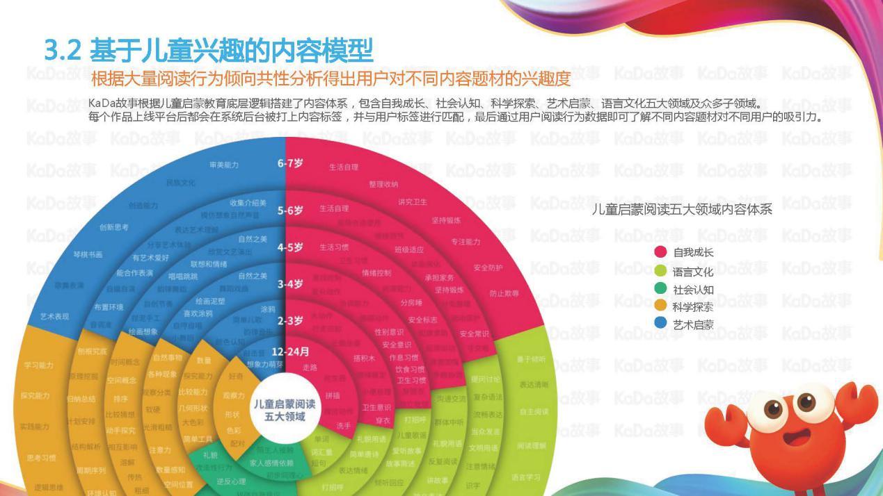 同时KaDa故事还建立了一套个性化推荐机制,作品上线平台后会参考儿童启蒙阅读内容体系被打上创新思考、艺术表现、生活习惯等内容标签,并与年龄、性别等用户标签进行匹配,形成基于儿童兴趣的内容模型,结合儿童内容评价体系,分析不同内容对用户的吸引力,让每一个孩子都能阅读到自己喜爱的、符合全面发展所需的优质内容。