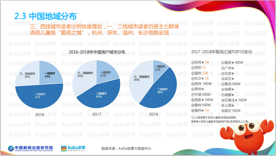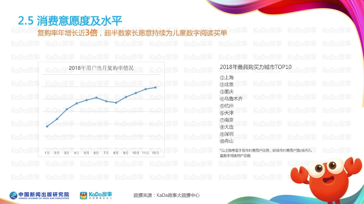 报告数据也显示,2018年国内家长消费意愿度迅速增强,当月复购率年增长近3倍,超半数家长愿意持续为优质儿童数字内容付费。在付费意愿城市排行榜中,上海、北京牢牢占据前两位,说明经济发达城市的家长更愿意为孩子的精神文化内容买单。